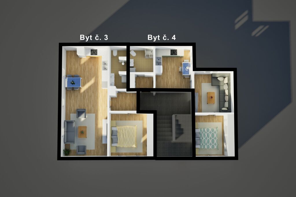 • Byt 2 (43 m²): dva pokoje, samostatná kuchyň a koupelna.