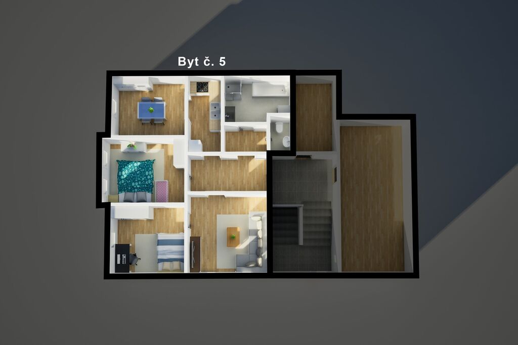 Největší byt v domě – 4+1, plně obyvatelný a aktuálně pronajatý spolehlivým dlouhodobým nájemníkům.