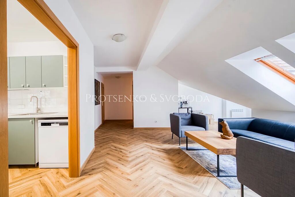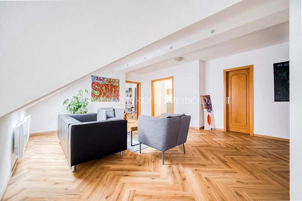 Byt se nachází v posledním patře historické budovy s výtahem a nabízí velmi praktické a vzdušné uspořádání: