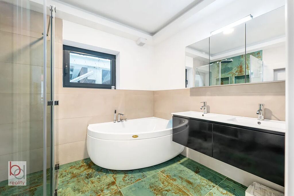 Koupelna vybavena vanou a sprchovým koutem,  umyvadlo, zrcadlo, WC.  Šatna vybavena vestavným nábytkem s policovým systémem.  Celkový perfektní dojem pak podtrhují dubové  podlahy,  předokenní žaluzie na všech oknech, podlahové vytápění ve všech místnostech, kamenná dlažba, sádrové omítky a mnoho ostatních - nadstandardně kvalitních prvků, které dotváří luxusní dojem celého bydlení. K dispozici od 01.01.2026.  Krásné  bydlení v centru města.  Byt je vybaven klimatizací.