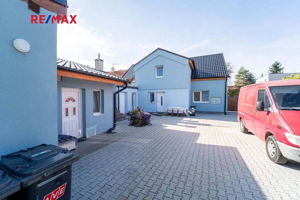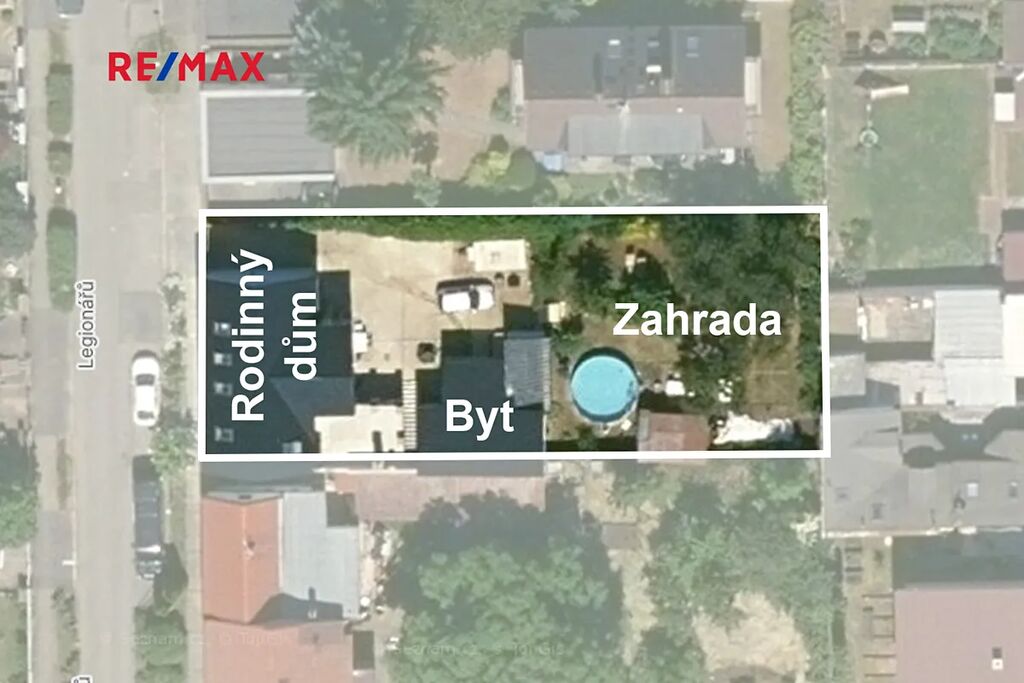 Zastavěná plocha a nádvoří domu o velikosti 358 m2 je osazeno zámkovou dlažbou a umožňuje vjezd na pozemek přímo z ulice Legionářů