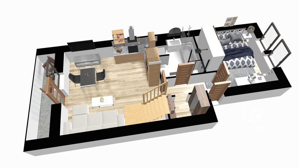• Ze vstupní chodby je vpravo ložnice, vlevo kuchyňský kout propojený s obývacím pokojem, ze kterého je vstup