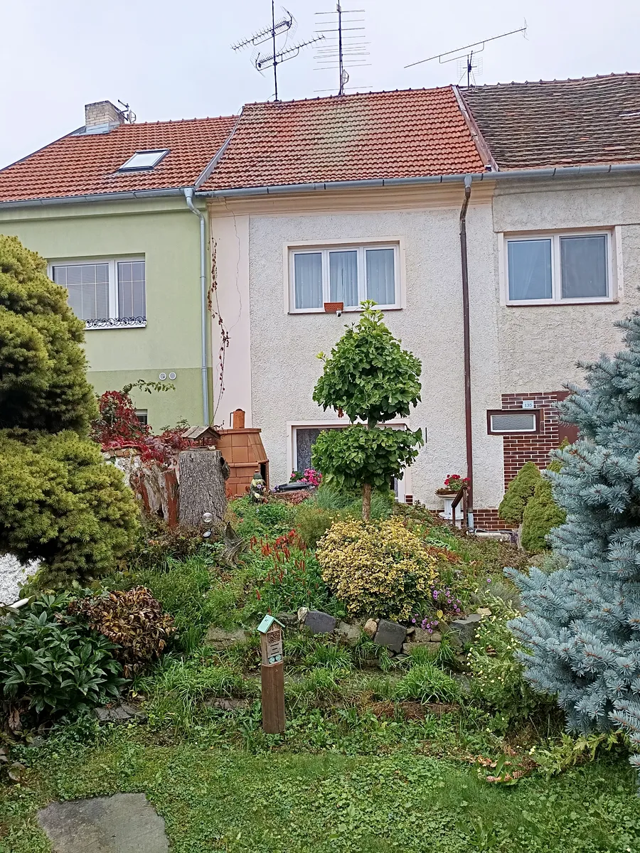 Dům stojí na pozemku o velikosti 200 m2 s malou předzahrádkou, kde je umístěn sklípkem a garáží ve dvorním traktu.