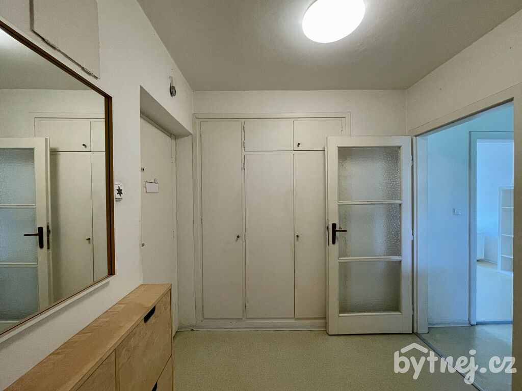 K bytu náleží lodžie, jedna sklepní kóje a jeden zděný sklep 7 m². Jednotka je kompletně vybavená. Z předsíně s vestavěnou skříní, přes kuchyň s lednicí, pračkou a samostatnou troubou s plynovým sporákem. Dále přes obývací pokoj s lodžií o rozloze 3m², který je orientovaný na klidný a slunečný jihozápad. Ložnice je vybavena dalším úložným prostotem včetně manželské postele.