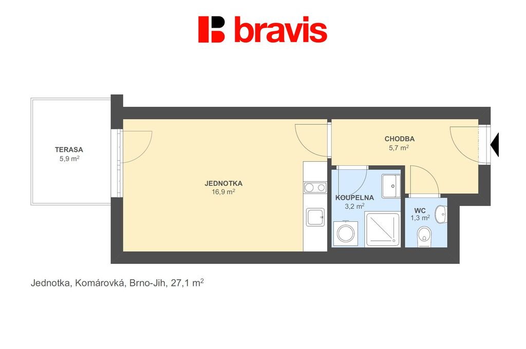 Jednotka disponuje promyšlenou dispozicí 1+kk s oddělenou toaletou a koupelnou se sprchovým koutem, což maximálně využívá každý metr čtvereční. Prostorná terasa o ploše 6 m² představuje ideální místo pro relaxaci, ranní kávu nebo večerní odpočinek s výhledem do okolí.