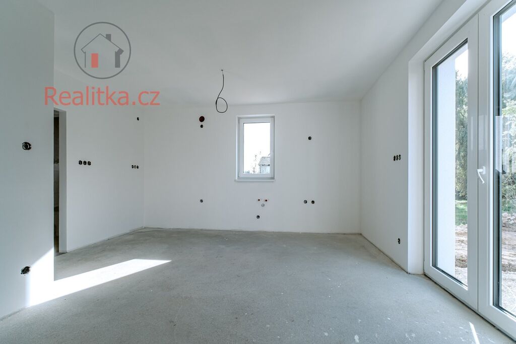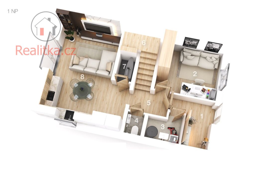 •	Přízemí: Přivítá vás prostorná chodba, technická místnost, elegantní WC s geberitem, útulný pokoj, praktická komora pod schody a moderní kuchyň spojená s obývacím pokojem, odkud je vstup na terasu.