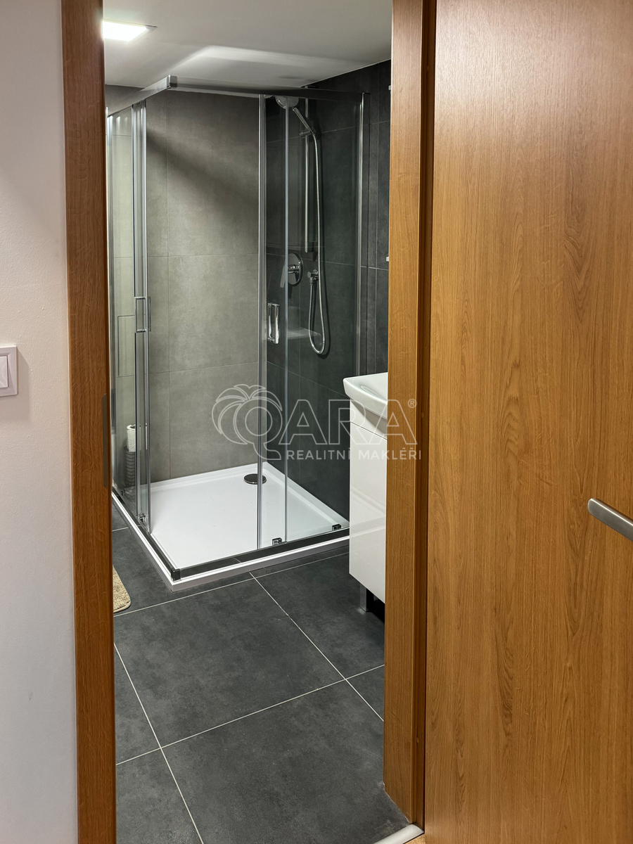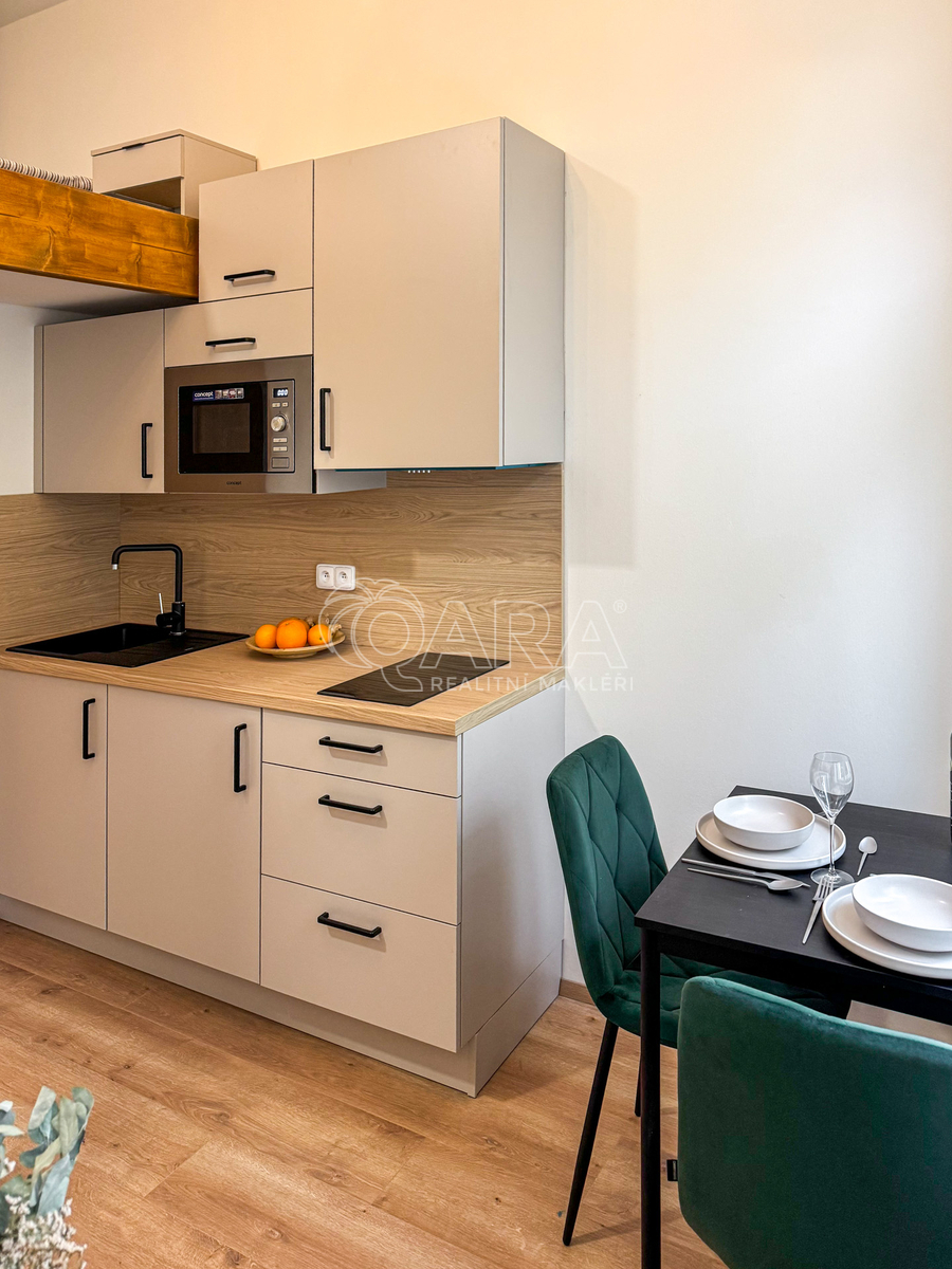 Byt je zařízen kuchyňskou linkou, jídelním stolem se židlemi, pohovkou a šatní skříní se zrcadlem, takže je možné se prakticky ihned nastěhovat. Koupelna s toaletou (3,8 m²) je prostorná v elegantním stylu.