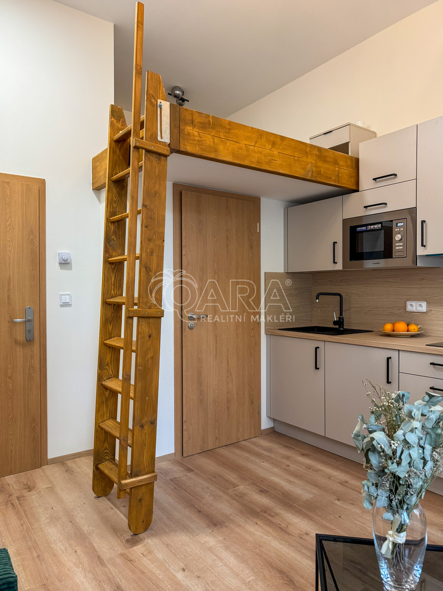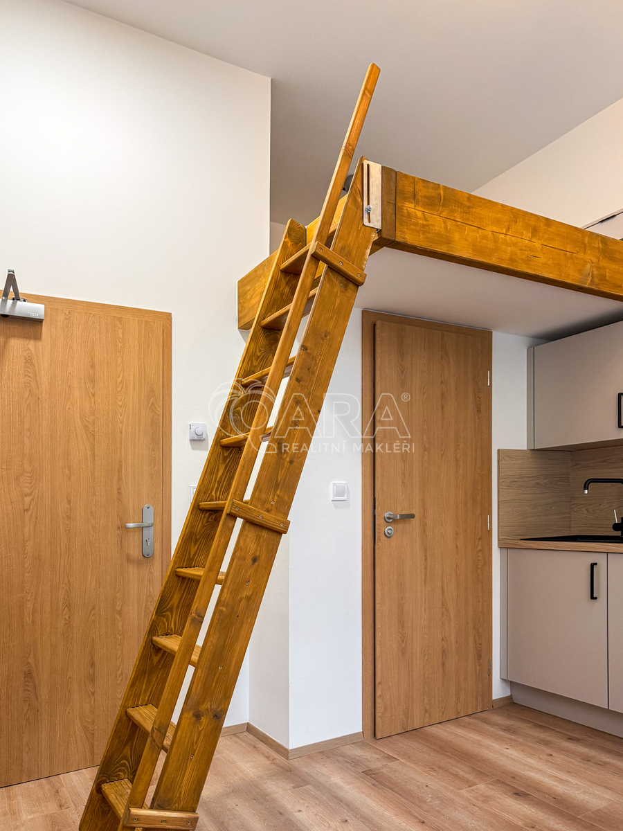 Dispozice je řešená velmi chytře: dole je obytná část s kuchyní (13,1 m²) a nahoře pohodlné patro na spaní o velikosti cca 5 m², díky čemuž působí byt větším a hlavně praktickým dojmem.