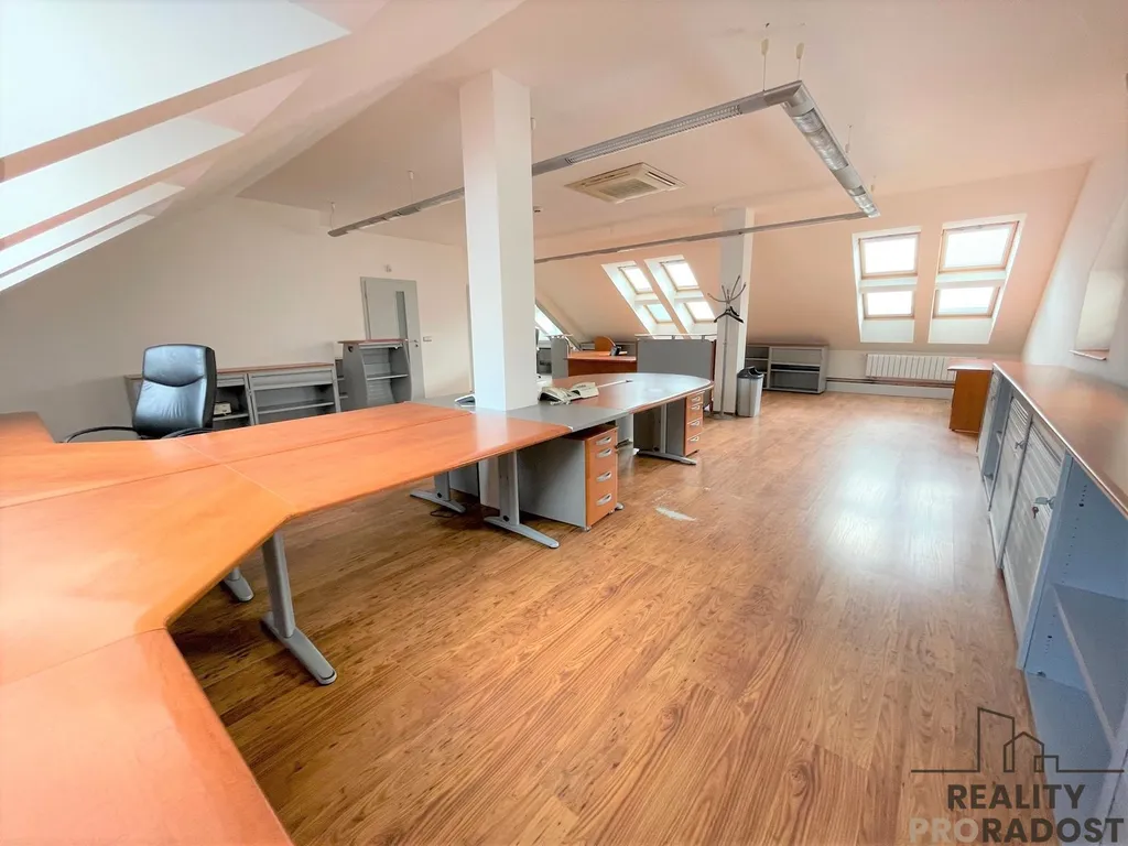 Moderní a reprezentativní kanceláře se nachází v 1.patře (podkroví) přízemního domu s odděleným uzamykatelným vchodem. Je zde jeden velký otevřený prostor + 3 samostatné kanceláře. Jsou zařízené nábytkem (kromě jedné místnosti, která sloužila jako sklad nebo archív), k dispozici je sociální zázemí a kuchyňka. Na podlahách dlažba a plovoucí podlahy.