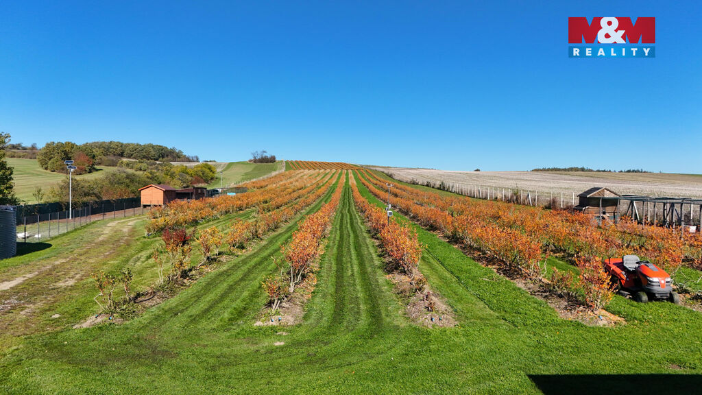 Nabízíme k prodeji plně funkční borůvkový sad o rozloze 70 922 m², z toho přibližně 40 000 m² tvoří aktivně obhospodařovaná plocha. Sad je celý oplocený a disponuje kompletním technickým zázemím, které zahrnuje: skladovací prostory s chladicí místností, prodejnu s místem pro přímý prodej, sociální zařízení, technické zázemí pro obsluhu farmy. Na pozemku je vysazeno přibližně 10 500 keřů borůvek dvou odrůd, které jsou pravidelně udržované a ve výborné kondici. Součástí sadu je kompletní závlahový systém s vlastními vodními zdroji – 2 vrtané studny a zásobníky na vodu. Prodej zahrnuje celý systém fungující farmy, včetně přidružených produktů a vybavení potřebného k pokračování provozu.