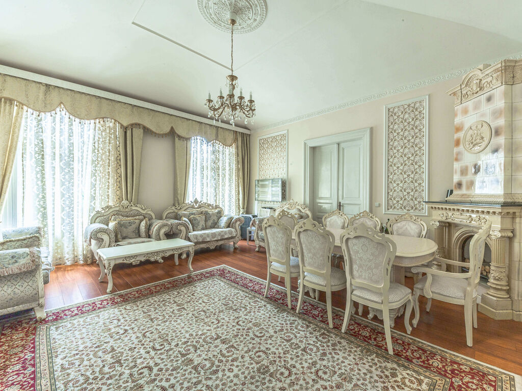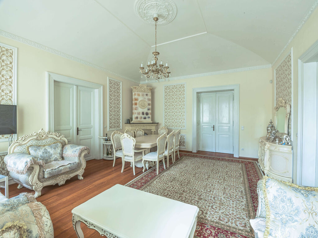 Vysoké stropy, štuková výzdoba, dekorativní tapety a luxusní nábytek podtrhují noblesu prostoru.