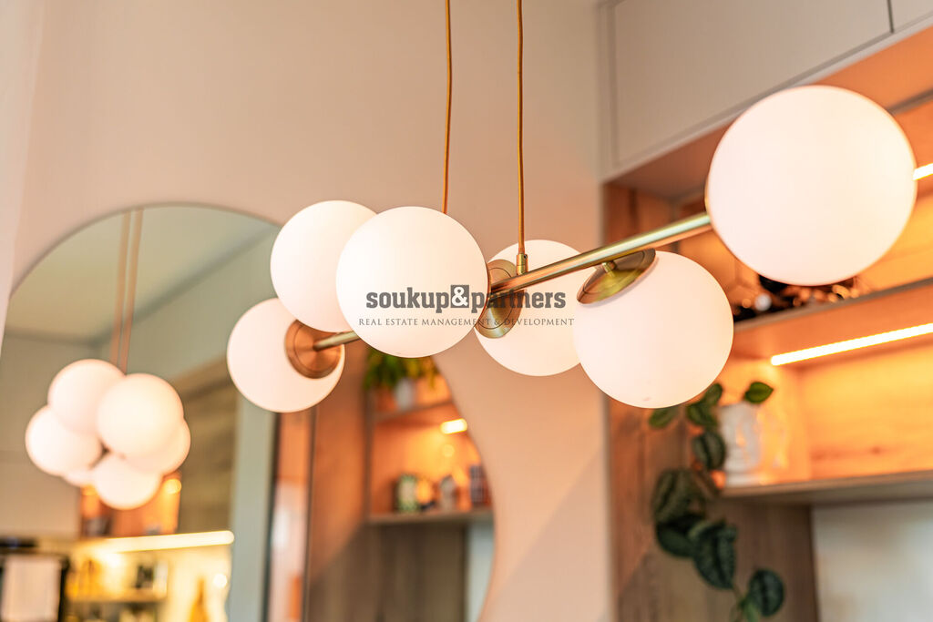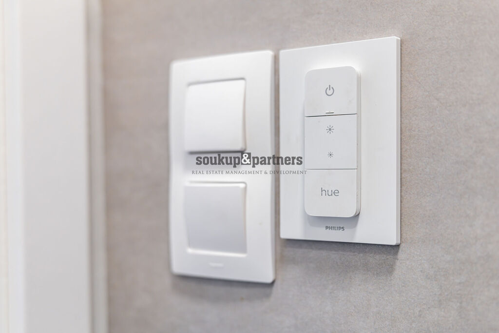 Jednotka je orientována na jihovýchod a nabízí nadstandardní, designově sladěné vybavení. Kuchyňská linka byla vyrobena na míru a osazena pracovní deskou Technistone, přičemž kuchyňský ostrůvek má samostatně přivedenou elektrickou přípojku pro maximální komfort při vaření i stolování. Součástí vybavení je americká lednice, vinotéka, LED podsvícení vestavěného nábytku a systém chytrého osvětlení Philips HUE. Interiér doplňují kvalitní interiérové dveře včetně obložení značky Sapelli, bezpečnostní vstupní dveře a videotelefon. O komfort se starají elektrické venkovní žaluzie a plisované sítě proti hmyzu.