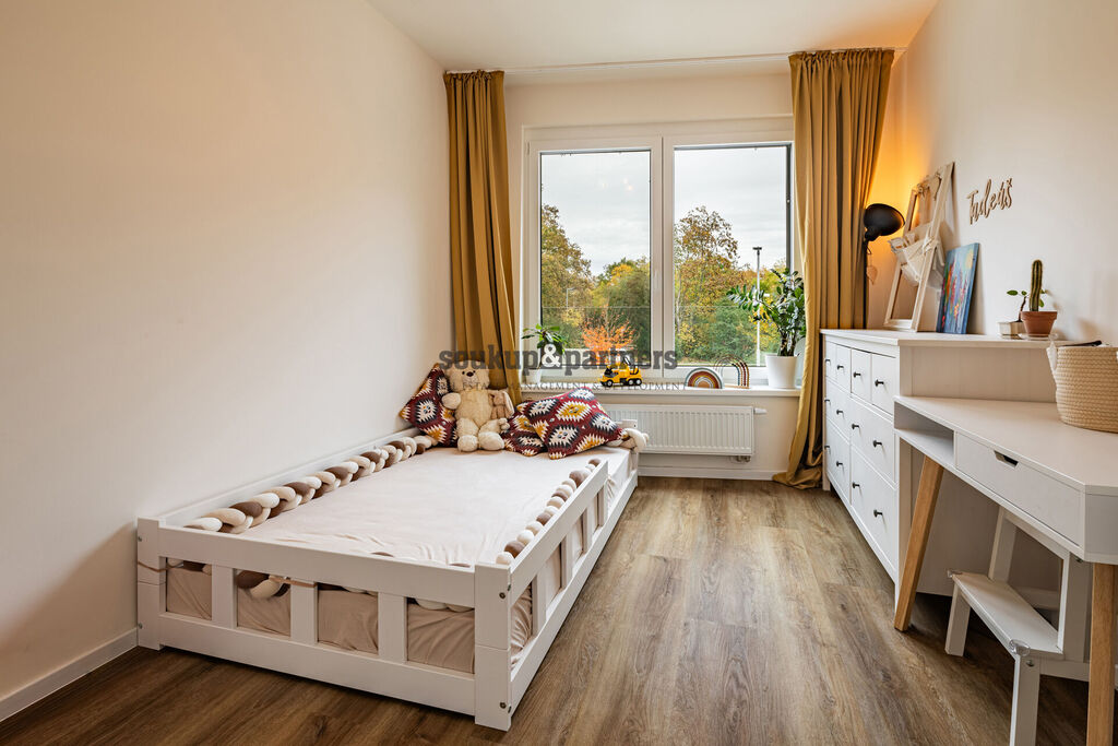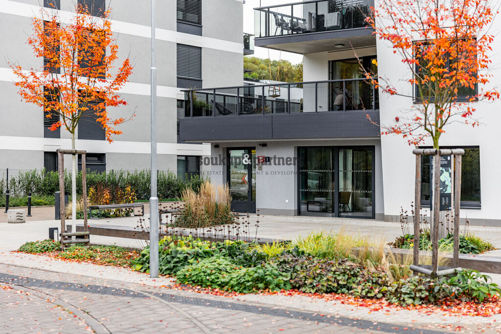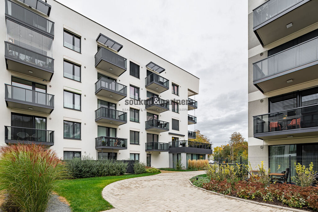 Byt je umístěn v rámci uzavřeného areálu, který zajišťuje vyšší úroveň bezpečnosti díky kamerovému systému, oplocení, vjezdové bráně a také recepci u vstupu do objektu. Celý projekt je navržen s ohledem na energetickou efektivitu a udržitelnost – vybaven je fotovoltaickými panely pro snížení nákladů na provoz společných prostor, retenčními nádobami pro svod dešťové vody a nádobami na bioodpad, což odráží moderní a ekologický přístup k bydlení.