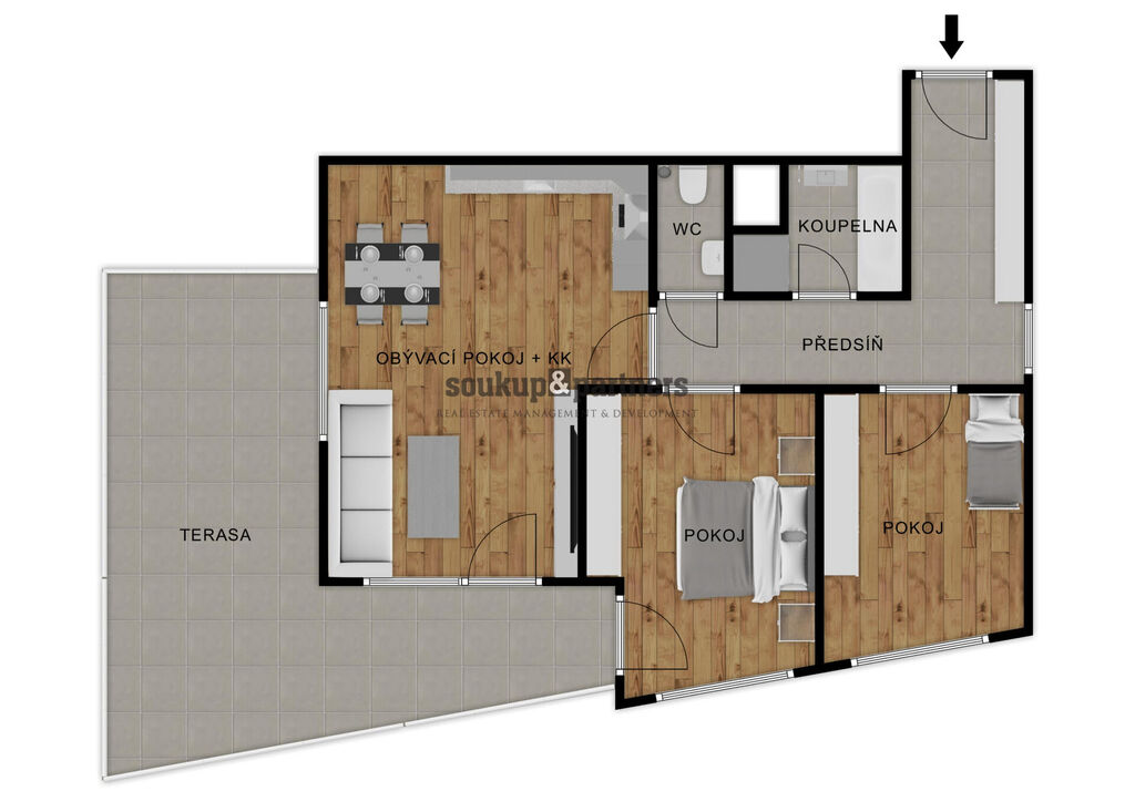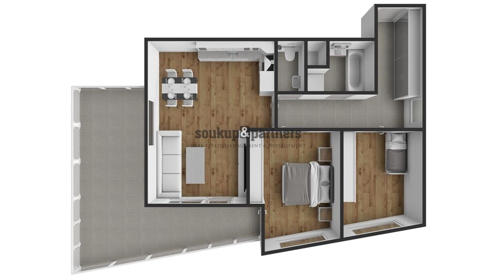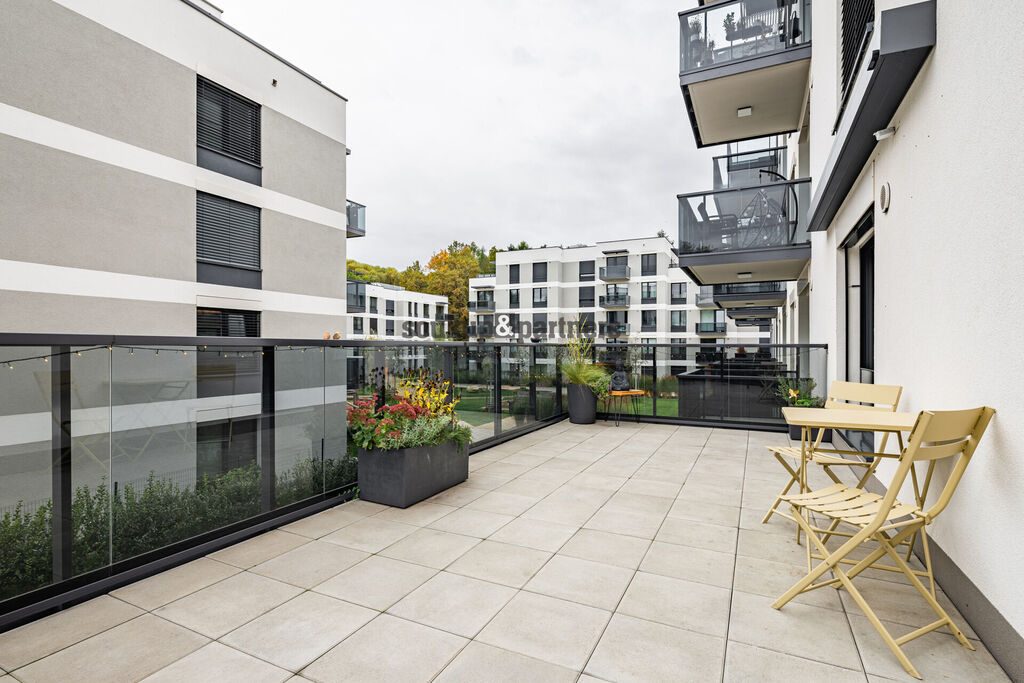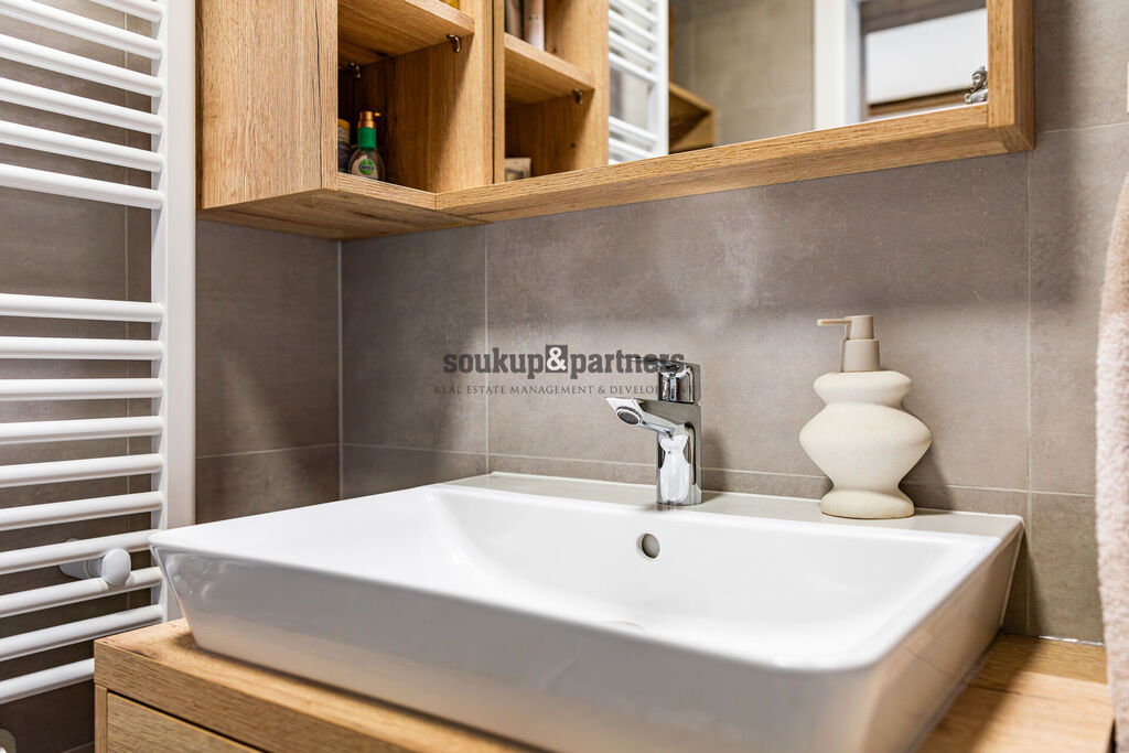 Velkým benefitem je prostorná terasa, která nabízí vysoký standard venkovního zázemí – najdete zde velkoformátovou dlažbu, skleněné zábradlí, elektrickou markýzu, osvětlení a přívod vody přes nezámrzný kohout. K bytu dále náleží garážové stání a sklep – vše je již zahrnuto v ceně.