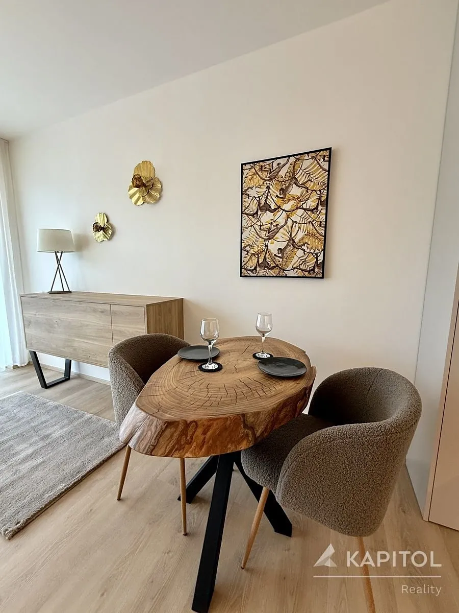 Ve 4. patře novostavby rezidence Diorit v Brně-Komíně čeká na nové nájemce útulný a prosluněný zařízený byt 1+kk, který nabízí moderní bydlení obklopené zelení. Budova stojí mezi vzrostlými stromy, pod domem protéká řeka Svratka a z prostorné lodžie se otevírá výhled do přírody.