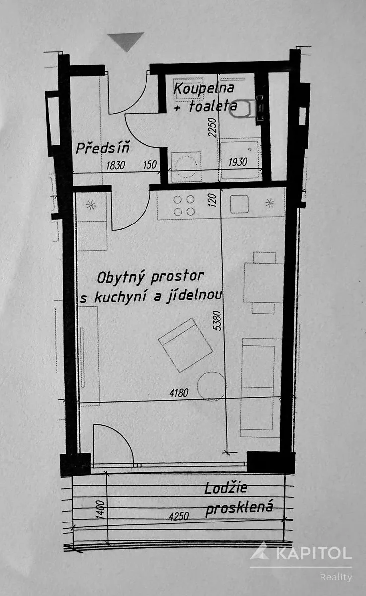 - obytný prostor s kuchyní a jídelní částí 22,5 m² – s kuchyňskou linkou na míru, myčkou a lednicí, doplněný nábytkem a rozkládací sedací soupravou vhodnou i pro každodenní spaní