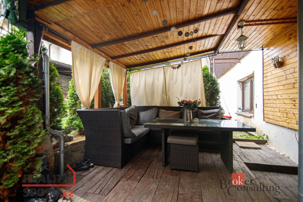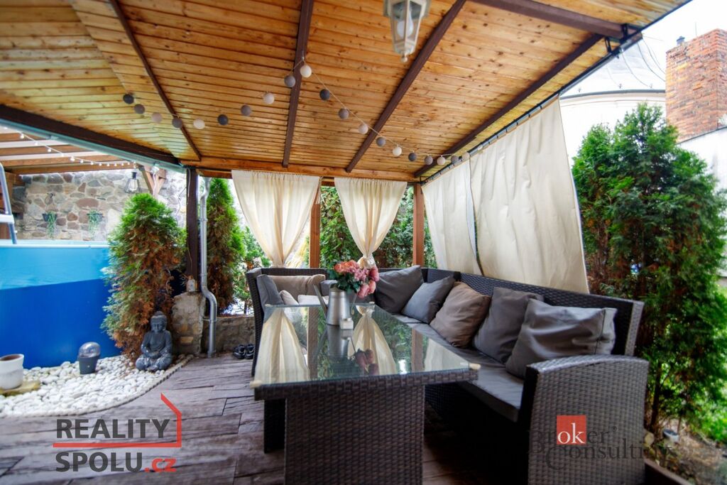 Před domem se nachází menší předzahrádka směřována do klidné ulice, za domem je větší zahrada s terasou, novým zastřešením a krbem. V rámci úpavy je možné demontovat bazén.