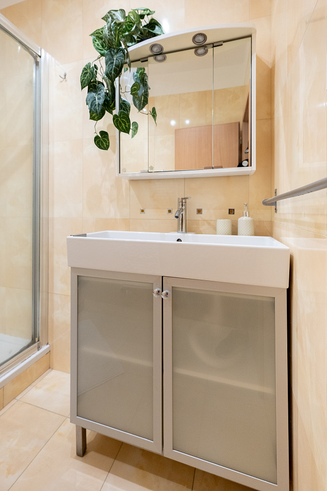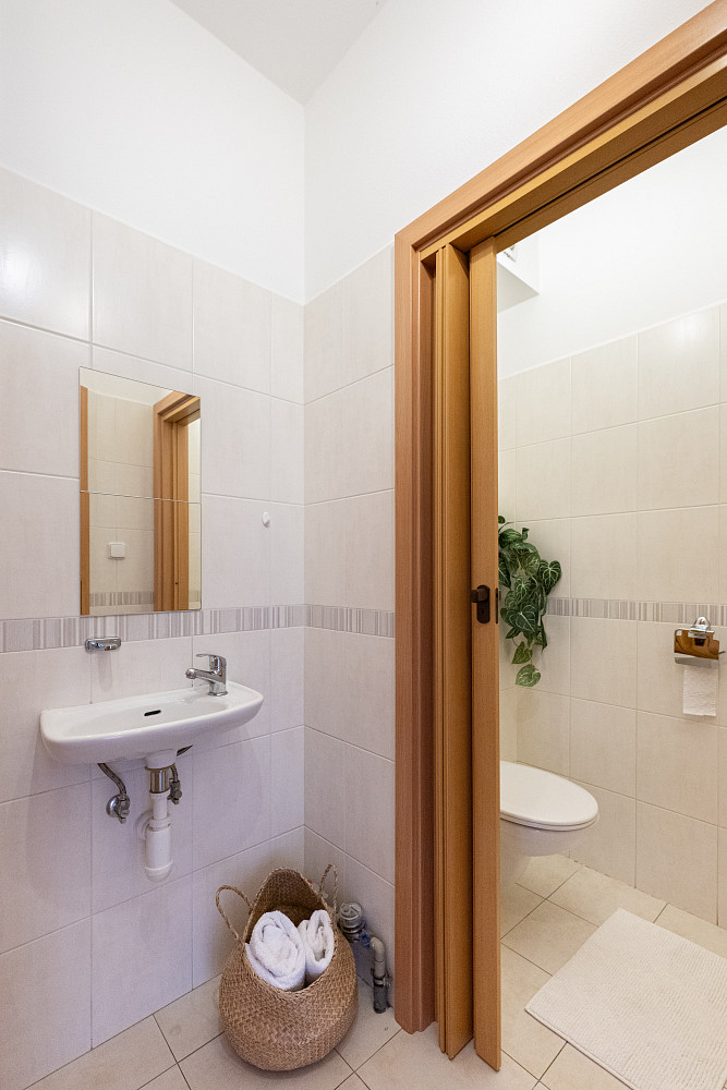 Koupelna se sprchovým koutem, samostatné WC s umyvadlem.