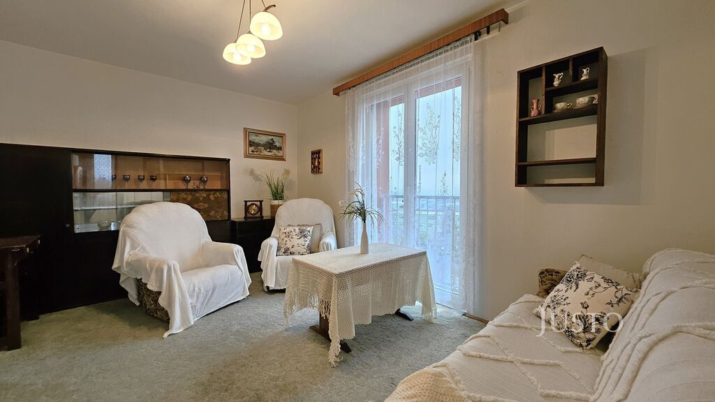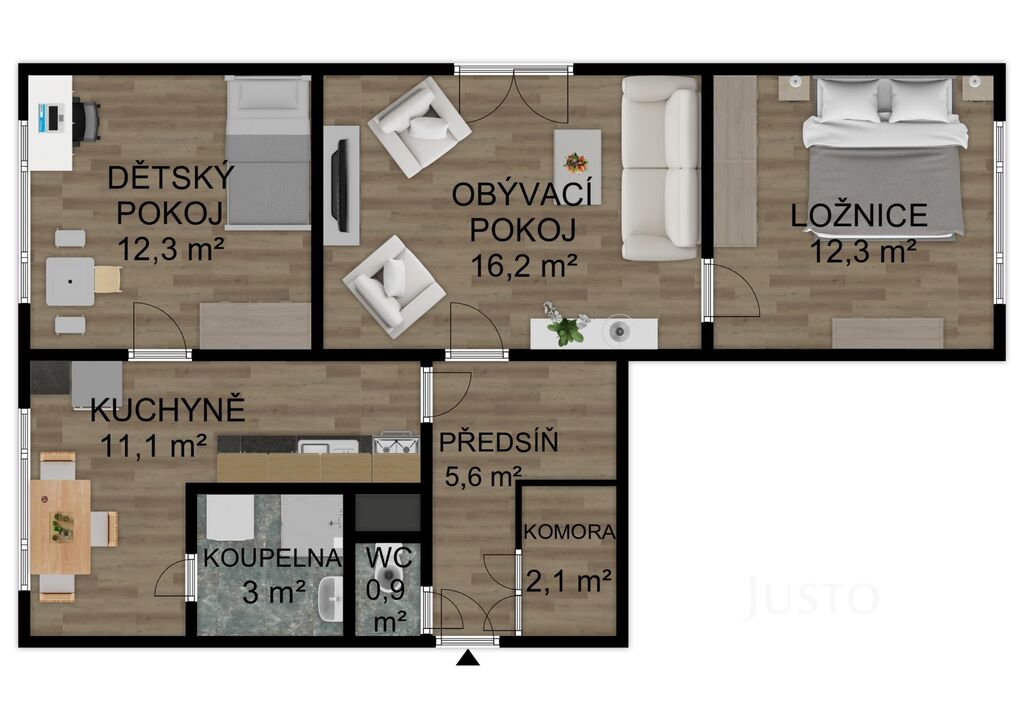 Dispozice bytu nabízí prostorný obývací pokoj (16,2 m²), dva samostatné pokoje (ložnice a dětský pokoj, každý 12,3 m²), kuchyň s jídelní částí (11,1 m²) a předsíň (5,6 m²) s praktickým úložným prostorem/komorou (2,1 m²). Byt je částečně vybaven a připraven k nastěhování či případné modernizaci dle vlastních představ. K bytu náleží sklep, což oceníte pro další možnosti uskladnění.