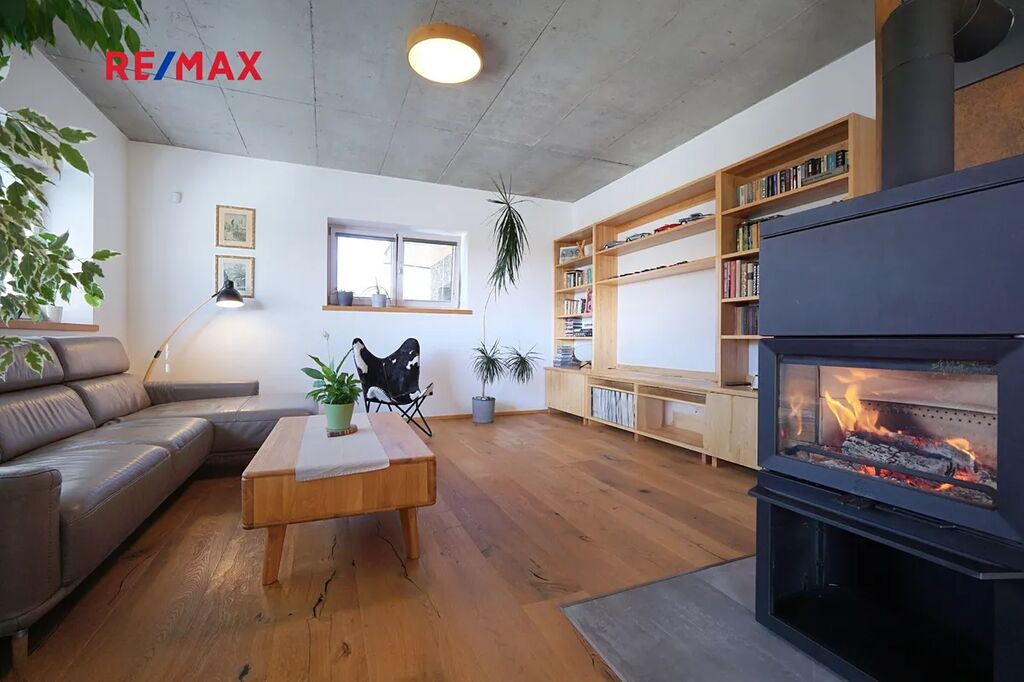 Celý interiér působí útulně a promyšleně, teplo domova zajišťuje kombinace podlahového vytápění a krbových kamen.