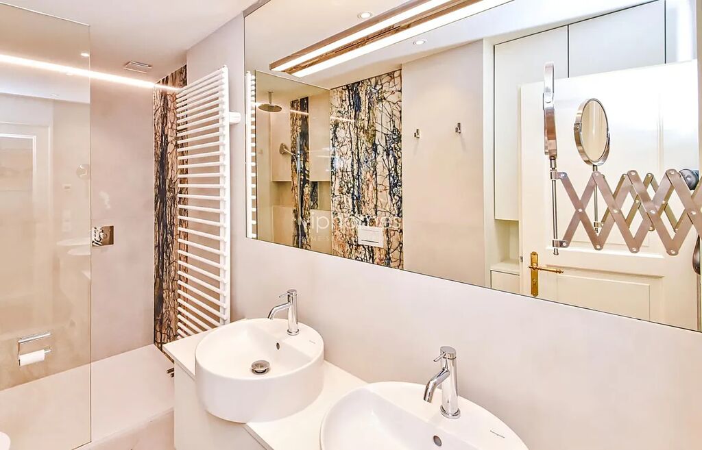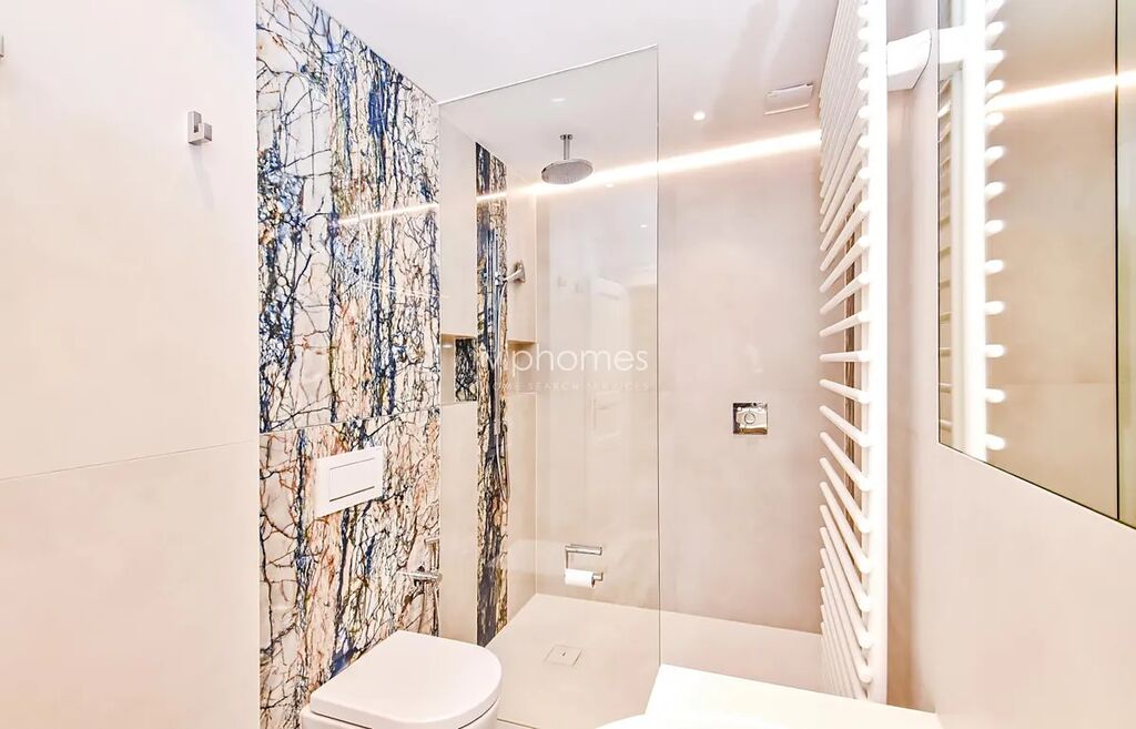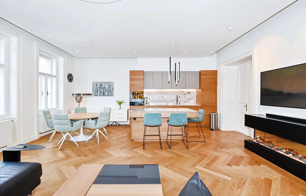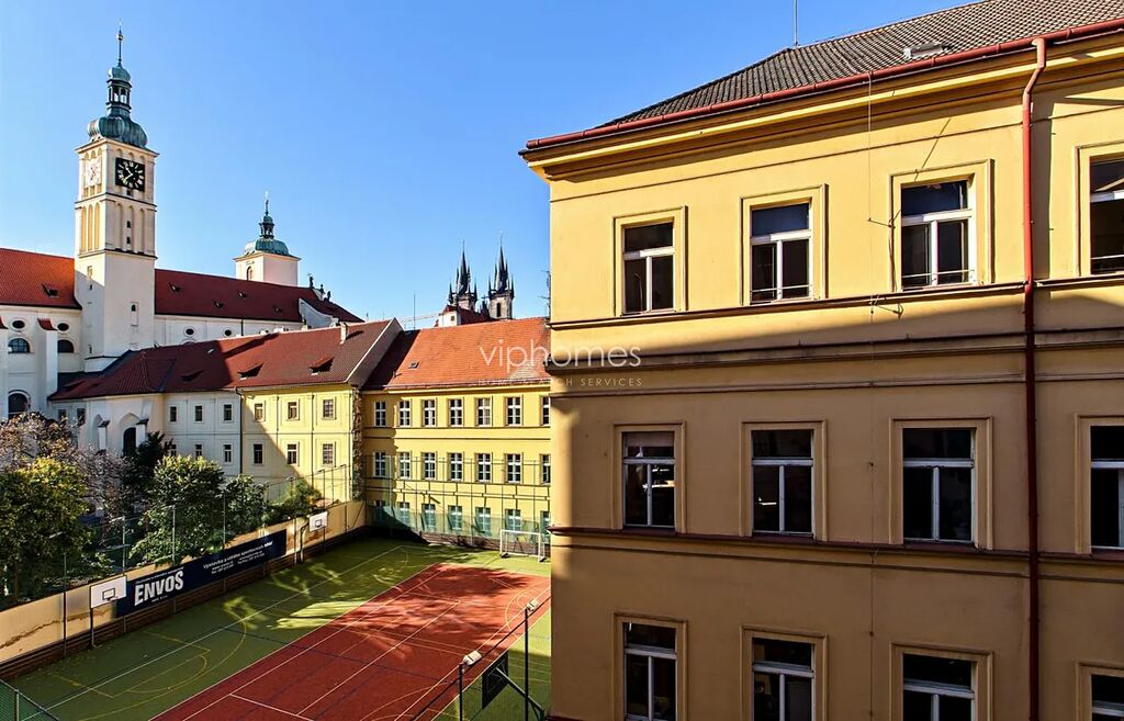 Vzdušný interiér tvoří prostorný obývací pokoj s jídelnou a plně vybavenou kuchyní, (orientace východ), dvě ložnice, (orientace západ) s výhledem na Týnský chrám, koupelna ze sprchovým koutem, toaletou, technická místnost s pračkou a sušičkou, toaleta pro hosty a vstupní hala. Kuchyň je vyrobena na míru ze špičkově kvalitních materiálů - dřevo, mramor, pracovní deska kuchyňské linky a ostrůvku je z mramoru v béžovo-medovém odstínu, zabudované spotřebiče, elektrická trouba značky V-ZUG. Dubové parkety jsou umístěny v obývací části bytu, na chodbě a v ložnicích. Dokonalé stropní podhledové osvětlení umocňuje příjemný vzhled a útulnost spolu s bio-krbem, TV je značky Samsung Frame a je vhodná pro projekci vašeho oblíbeného umění.umění Vkusně a nákladně rekonstruovaný byt se nabízí vybavený nábytkem, po domluvě i bez. Zálohy na energie se hradí zvlášť.