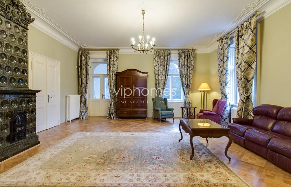 Zachované původní prvky, štuky, vysoké stropy, troje kachlová kamna, parkety, dlažba, dřevěné okenice. Vila je vybavena videotelefonem, alarmem a má satelitní příjem. Poplatky za služby, vodu a vytápění cca 20 000 Kč měsíčně. Elektřina se hradí zvlášť (převod na nájemce). Možnost pronajmout bez nábytku.