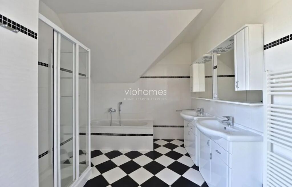 Rodinný dům 6+kk v příjemném prostředí nové vilové zástavby v Průhonicích - jedné z nejhezčích a nejvyhledávanějších lokalit pro rodinné bydlení v blízkosti Prahy, cca 15 min. jízdy od centra. Dominantu obce tvoří zámek s půvabným zámeckým parkem, který patří do seznamu chráněných památek UNESCO. Dále zde naleznete nádhernou botanickou zahradu. Množství hotelů a restaurací, včetně malého pivovaru, dodávají obci hlavně v letních měsících své kouzlo. Asi ve vzdálenosti 1000 m od obce najdete velké nákupní centrum a rozlehlý vodní park, který ocení hlavně děti. V obci je také škola a školka pro děti, pro anglicky mluvící děti je mezinárodní anglická škola a školka na Praze 4, vzdálená 20 minut autem. Zastávka školního autobusu nedaleko od domu.