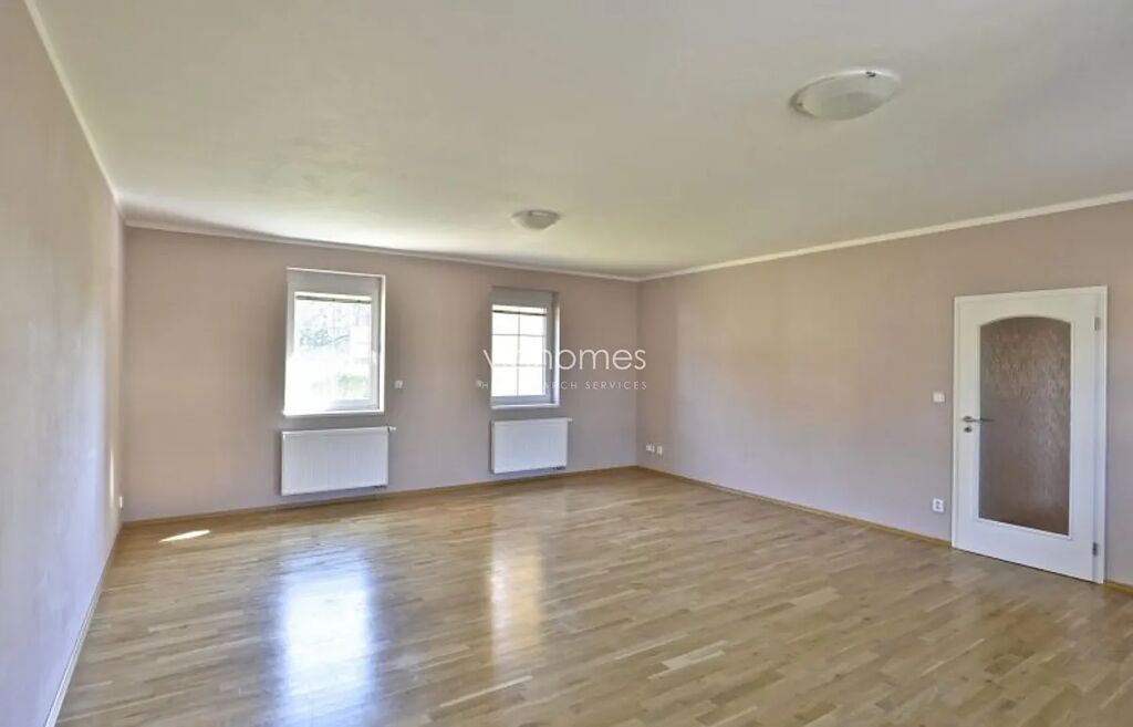 Dům má celkem 5 ložnic, 3 koupelny. Velký přízemní otevřený prostor tvoří obývací pokoj s krbem, kuchyň s přístupem na terasu a zahradu. Dále je zde ložnice, koupelna se sprchovým koutem a WC. Kuchyňská linka z roku 2022, vybavená veškerým komfortem (myčka nádobí, vestavěná varná deska, vestavěná elektrická trouba, odsavač par, lednice s mrazákem). V patře jsou čtyři ložnice, koupelna s vanou i sprchou, samostatné WC, dva balkony přístupné ze dvou ložnic. V suterénu je umístěna prádelna sušárna, herna, fitness, koupelna a technické zázemí. K dalšímu vybavení patří elektronické zabezpečovací zařízení napojené na PCO, laminátové podlahy, obklady a dlažby, vestavěné skříně v předsíni, satelitní TV připojení. Dům se k pronájmu nabízí nezařízený. Parkování je zajištěno v prostorné garáži pro dva vozy. Zálohy na služby a spotřebu energií včetně údržby zahrady 13 000 CZK / měsíc. Zateplení fasády, balkonů a terasy, byla provedena rekonstrukce interiéru v roce 2022, koupelny, kuchyň.