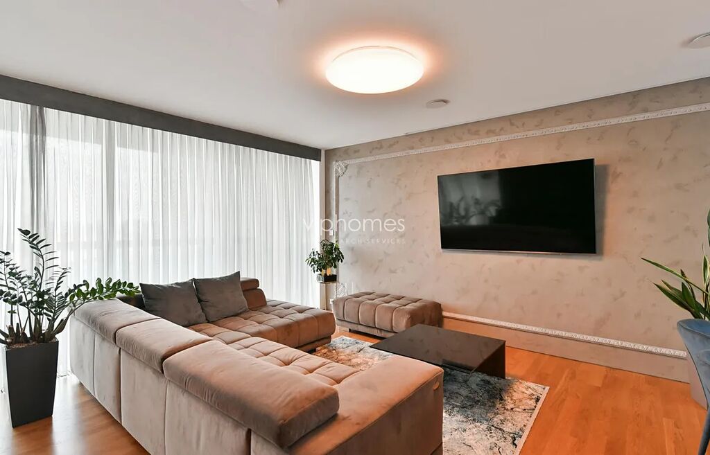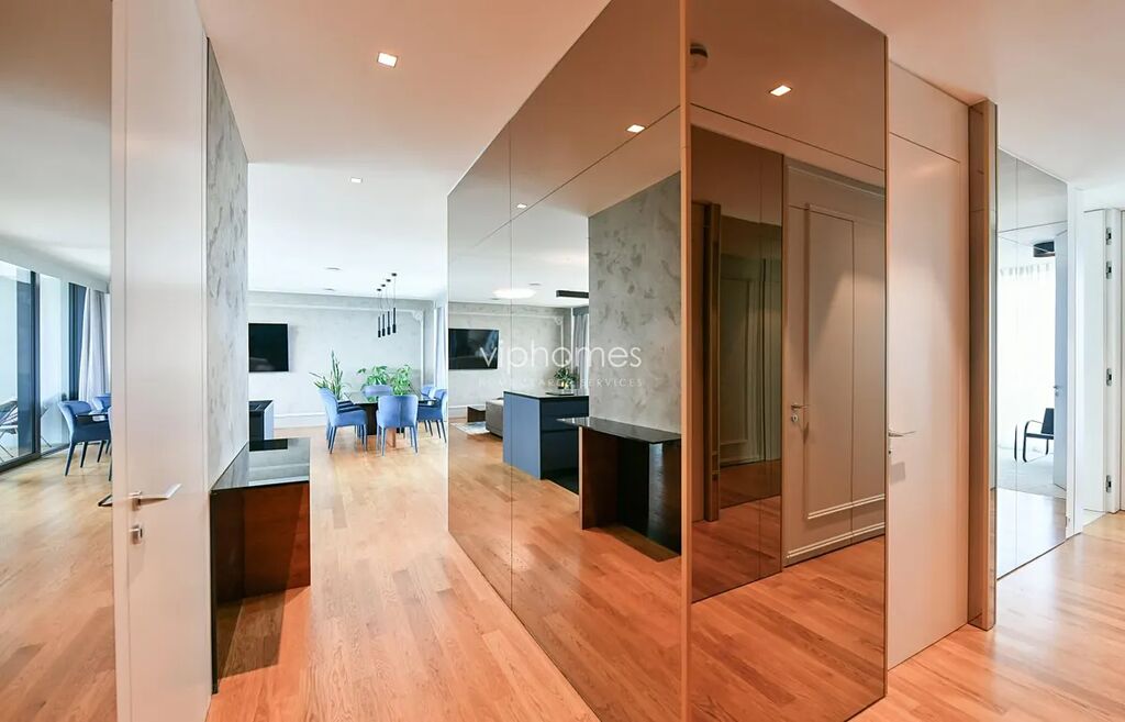 Byt s panoramatickými výhledy na Prahu ze všech místností, je umístěn v 11. patře nejvyšší rezidenční budovy v České republice. Interiér bytu nabízí prostorný obývací pokoj s kuchyňským koutem, tři ložnice, z čehož třetí ložnice je šatna se zabudovaným skříněm, tři koupelny (vana, sprcha, bidet), samostatnou toaletu. úklidovou komoru, místnost na pračku) a vstupní halu. Kuchyně je vybavena všemi potřebnými spotřebiči nejvyšší řady. Koupelna prosvětlena francouzským oknem, keramika, podlahové konvektory, obložení přírodním kamenem. K bytu náleží dva balkony. K dalšímu vybavení patří protipožární vchodové dveře, na balkonech celoskleněné zábradlí, nášlapná vrstva z exotického dřeva, bezpečnostní zámek. V celém bytě je on-line ovládání na teplotu v bytě, osvětlení. Chlazení v bytě kapilárním stropním systémem - zdravotně šetrným vytápěním a chlazením vzduchu. Podlahové konvektory zajišťují přívod tepla, rekuperace vzduchu v bytě. K bytu náleží 2 podzemní garážové stání a sklep. V bytě jsou vestavěné skříně na míru, elektrické stahovací rolety v obývacím pokoji, jinak jsou na oknech záclony a závěsy.