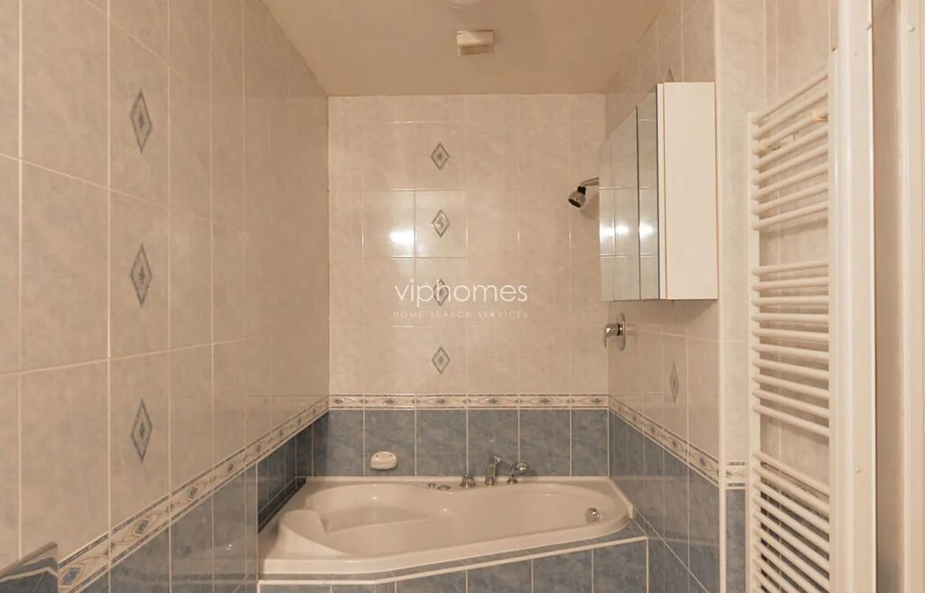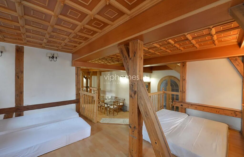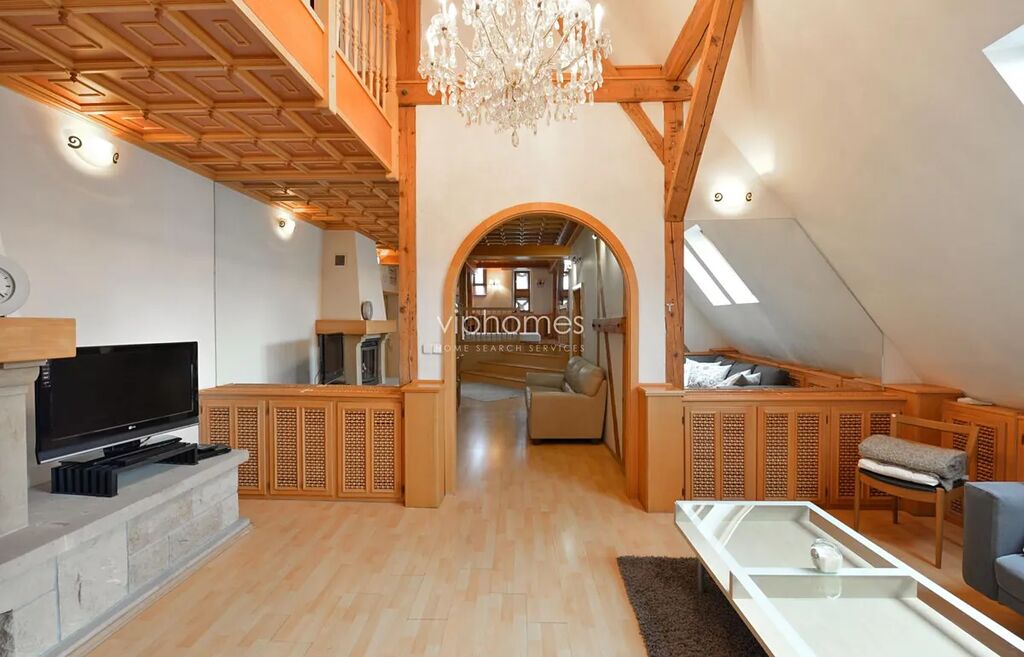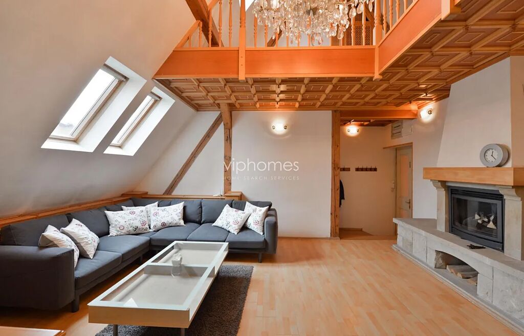 V přízemí je kompletně vybavena kuchyň s přístupem na balkon, obývací pokoj s dvojitou výškou stropu, hlavní ložnice s šatnou a plně vybavenou koupelnou s vířivkou a saunou. V patře je umístěna druhá ložnice. Optickou dominantou přízemí je nepochybně schodiště. Obývacímu pokoji vévodí stylový krb, v bytě je moderní kuchyňské a koupelnové vybavení. Výhled na Pražský hrad a Staré Město.