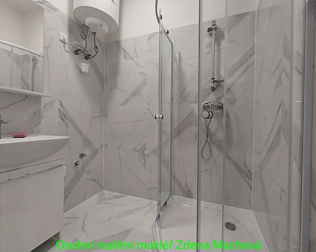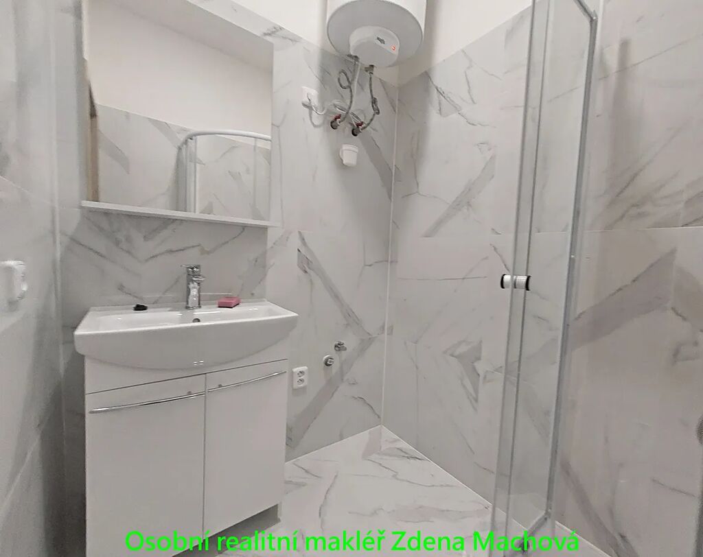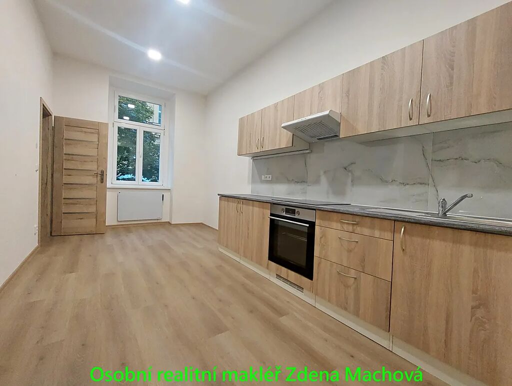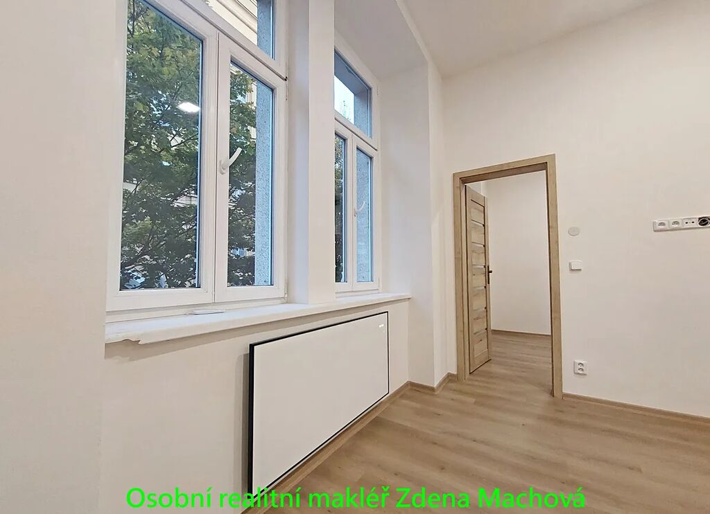 Uvnitř bytu v kuchyni najdete novou kuchyňskou linku, vchod do koupelny se sprchovým koutem, bojlerem a místem pro pračku, a prostorný vedlejší pokoj s vysokými stropy a velkými okny do ulice.