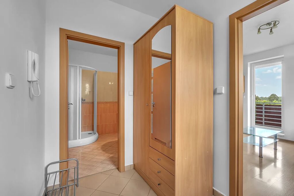 K bytu náleží příjemný balkon o rozloze 5,6 m², poskytující prostor pro relaxaci a výhled do okolí. Byt se pronajímá částečně vybavený, zahrnující kuchyňskou linku s troubou, pračku, obývací stěnu a šatní skříň.