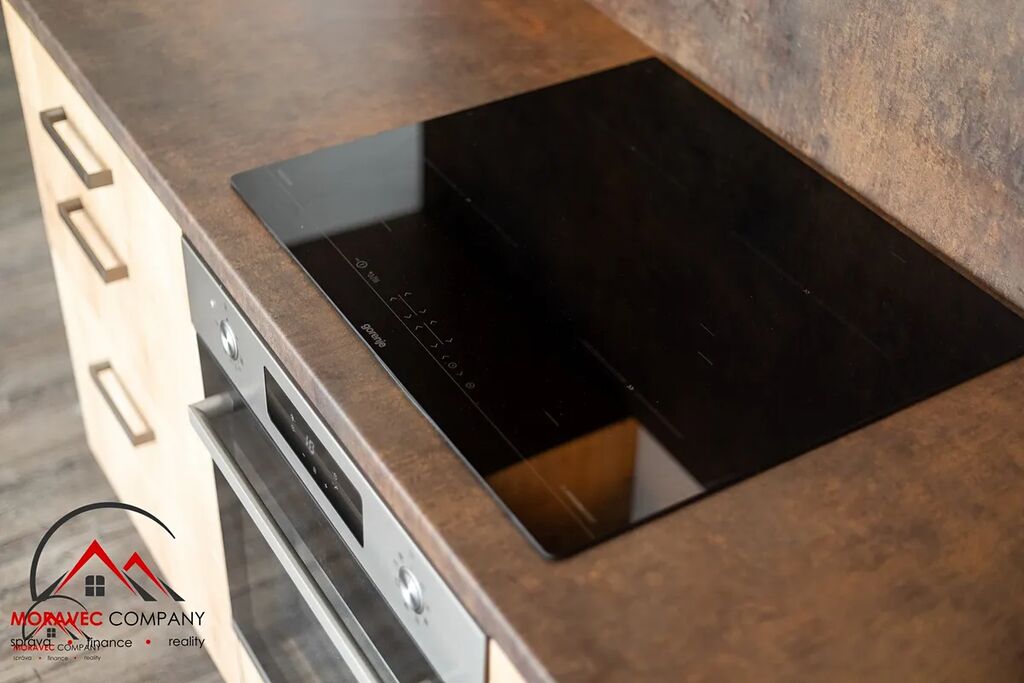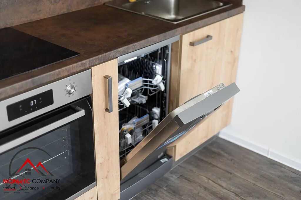 Vybavení bytu zahrnuje kuchyň s elektrickou troubou, indukční varnou deskou, digestoří a zabudovanou myčkou. Koupelna je vybavena sprchovým koutem a WC. Ohřev vody zajišťuje elektrický bojler.