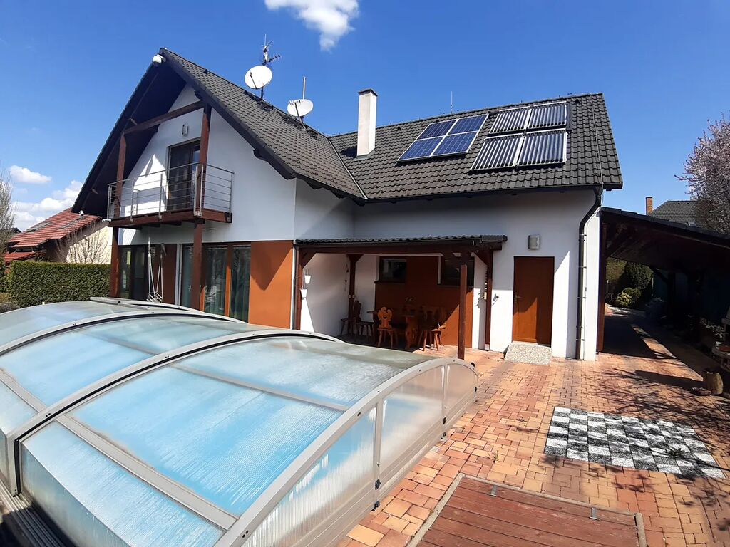 K domu náleží garáž, udržovaná zahrada, krytý bazén, venkovní krytá terasa, stání pro dva osobní automobily.