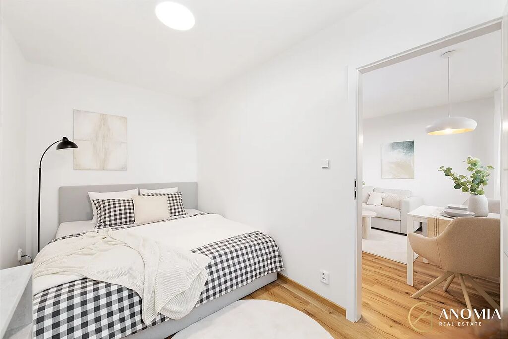 V bytě dále najdete útulnou ložnici, prostornou vstupní chodbu a moderní koupelnu se sprchovým koutem, WC, led zrcadlem, umyvadlovou skříňkou a velkoformátovými obklady, které podtrhují elegantní, nadčasový charakter interiéru. Ve sprchovém koutě je praktická podsvětlená nika.