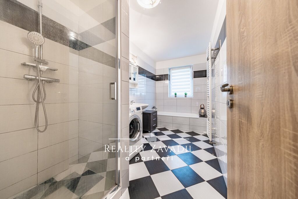 V přízemí se nachází útulná bytová jednotka 3+kk, která nabízí světlý a prostorný obývací pokoj se vstupem na zahradu, vybavenou kuchyň s americkou lednicí a jídelní částí, pokoj se vstupem na zahradu, samostatnou ložnici, koupelnu s vanou a sprchovým koutem, samostatné WC a chodba.