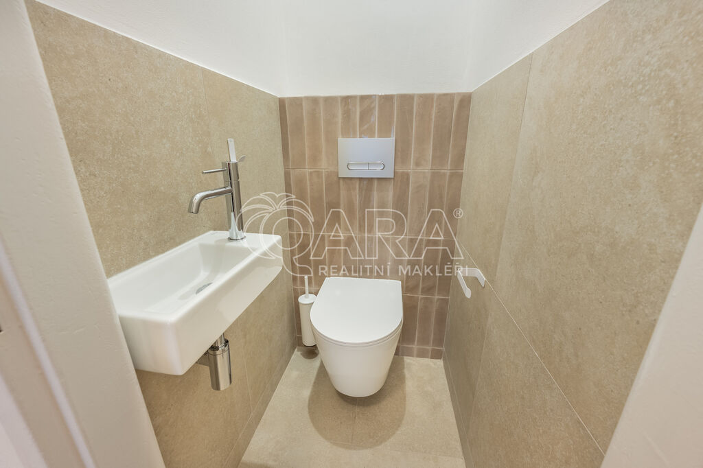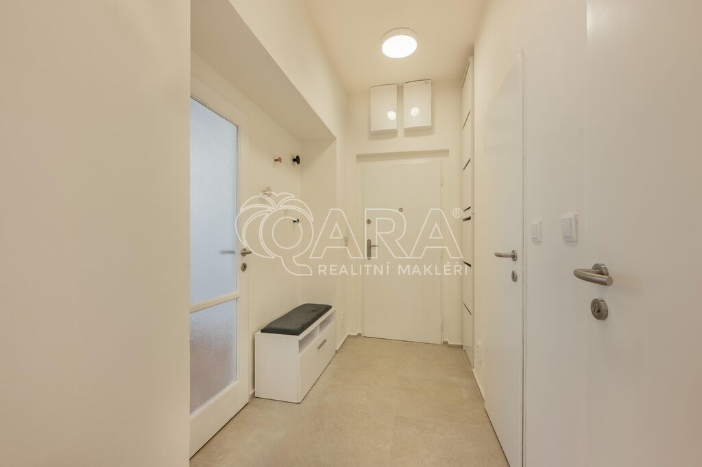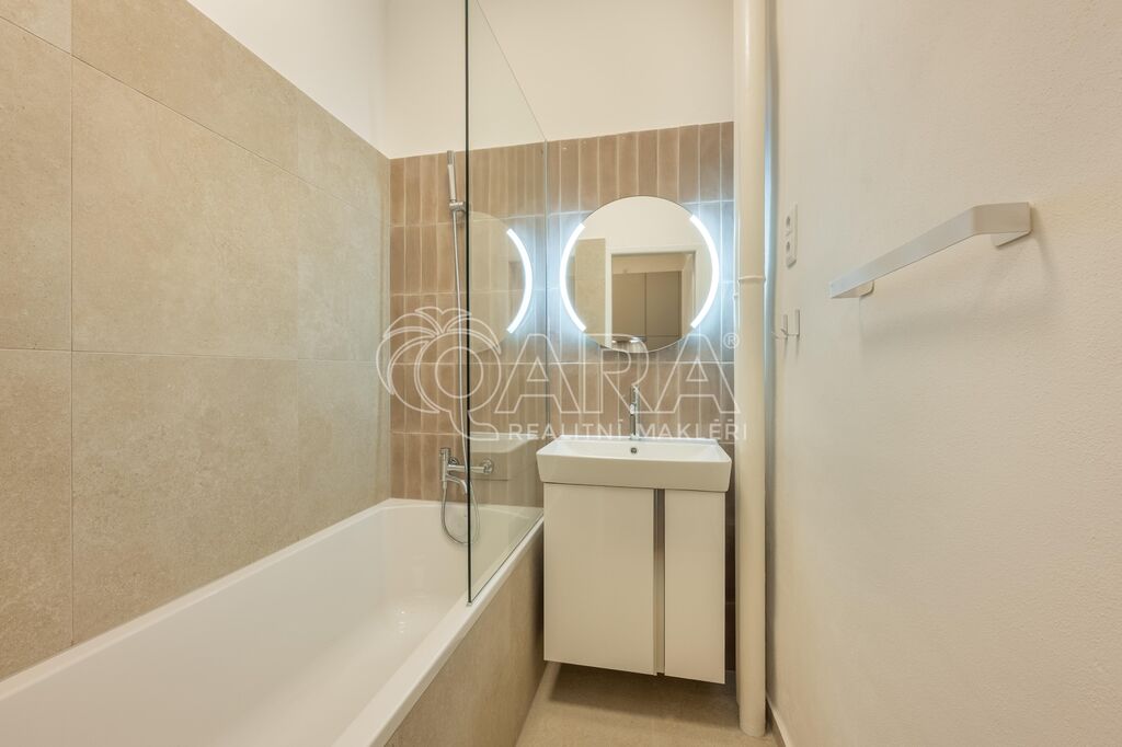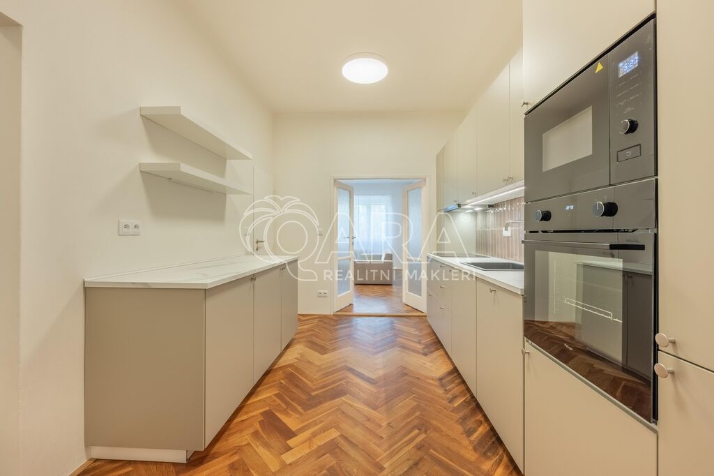 Interiér prošel kompletní renovací – majitel si dal záležet na detailech. Na podlahách jsou krásné parkety, nová kuchyňská linka nabízí plno úložného prostoru, koupelna s vanou je designově sladěná a WC je oddělené. Obě ložnice jsou orientované do vnitrobloku (jedna má balkon, druhá velkou vestavěnou skříň), obývací pokoj je směrem do ulice.