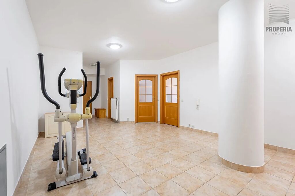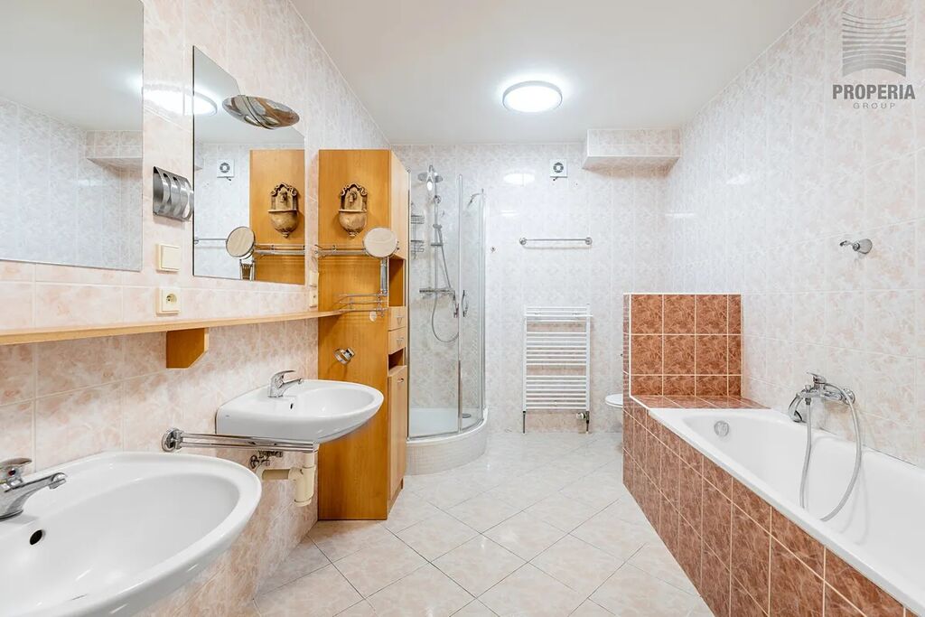 • Koupelna (9,4 m²) – velmi prostorná, s vanou, sprchovým koutem, dvěma umyvadly a druhým WC