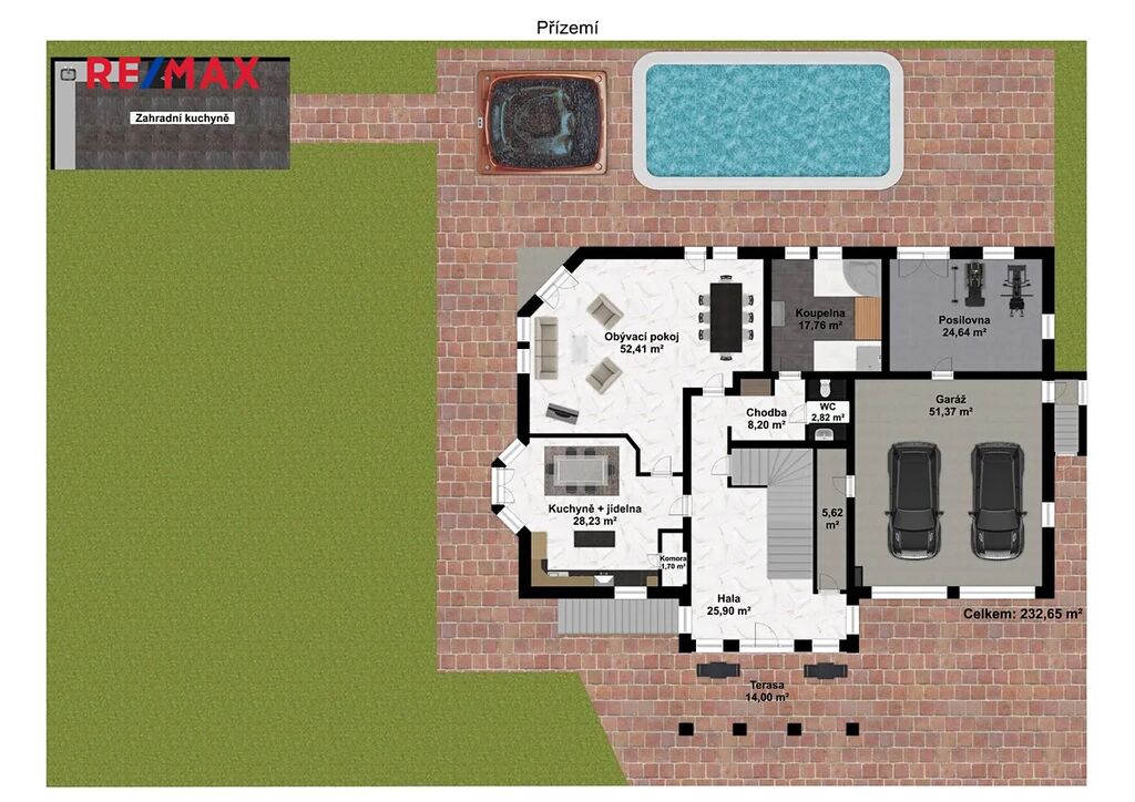 V 1. NP se nachází: Kuchyně (cca 28,23m²), obývací prostor (cca 52,41m²), hala (cca 25,90m²), chodba (cca 13,82m²), komora (1,70m²), koupelna s Infrasaunou (cca 17,76m²), toaleta (cca 2,82m²), technická místnost (cca 24,65m²), terasa (cca 14m²), garáž (cca 51,37m²), fitnes ( cca 25m²).