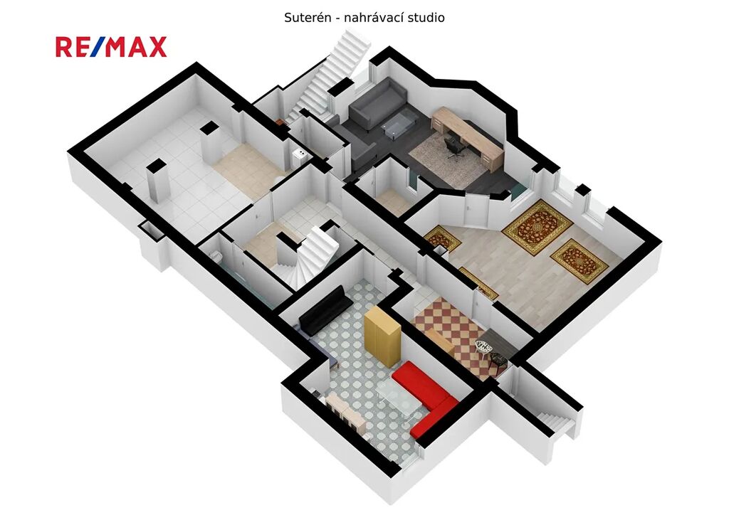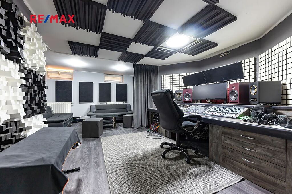 Suterén domu: Nahrávací studio (cca 39m²), obývací prostor (cca 42m²), prádelna (cca 26m²), toaleta (cca 3,5m²), chodba (cca 12m²), kotelna (cca 36m²). Suterén domu disponuje samostatným vstupem.