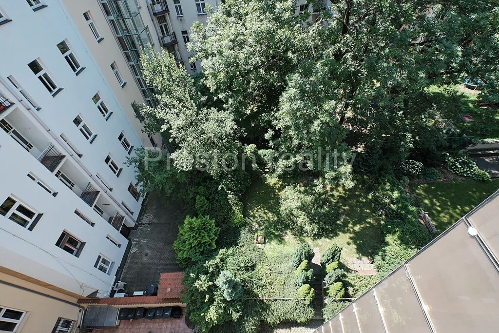 Nabízíme exkluzivně k pronájmu hezký byt 3+kk, 72 m2 ve vyhledávané lokalitě Vinohrad, přímo u parku Žižkovské věže (Mahlerovy sady) v bezprostřední blízkosti nám. Jiřího z Poděbrad. Byt je umístěn v 5. patře udržovaného činžovního domu s výtahem. Byt se skládá z obývacího pokoje (23 m2), ve které je umístěná kompletně vybavená kuchyňská linka (sklokeramická varná deska, trouba, mikrovlnná trouba, myčka, digestoř), volně stojící lednice s mrazákem a kuchyňský stůl s židlemi. Z okna obývacího pokoje (kuchyně) jsou nádherné výhledy na park s Žižkovskou věží (východní orientace). Další dva samostatné pokoje mají západní orientaci do klidného vnitrobloku s plochou 17 a 15 m2. Menší z nich je částečně vybaven nábytkem (historická knihovna. Psací stůl na fotografiích byl již odvezen) a má přístup do malé uzamykatelné komory. Větší pokoj má k dispozici šatní skříň a velkoplošnou TV.
