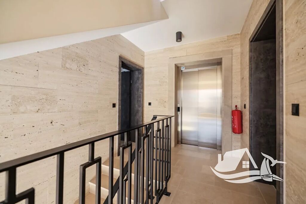 Apartmán se nachází v prvním patře moderní budovy s celkem osmi bytovými jednotkami. Dispozici tvoří vstupní chodba, koupelna, dvě ložnice, hlavní ložnice s vlastní koupelnou, prostorná kuchyně s jídelnou a obývacím pokojem a zastřešená terasa s výhledem na moře. Celková čistá obytná plocha činí 108,68 m², a k bytu dále náleží dvě parkovací místa před budovou, což zvyšuje celkovou užitnou plochu na 113,95 m².