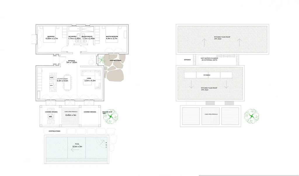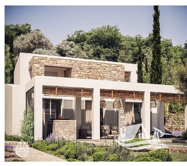 Tento bungalov se dvěma ložnicemi nabízí otevřený obývací a kuchyňský prostor s ručně vyrobenými prvky, prostornou krytou terasu s možností ohniště či grilu a jedinečný středomořský styl s využitím přírodních materiálů.