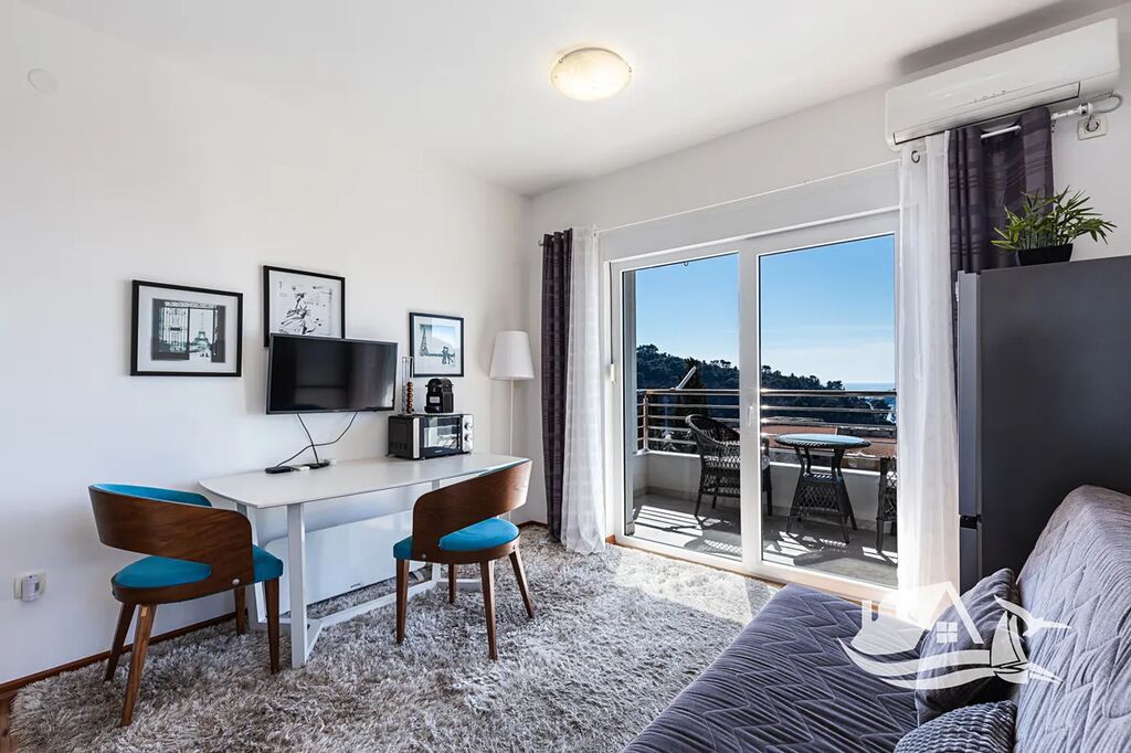 Nabízíme vám výjimečný dvoupokojový apartmán s dechberoucím výhledem na moře, který se nachází v klidné a malebné lokalitě ideální pro odpočinek i celoroční bydlení. Tento elegantně řešený byt spojuje moderní vybavení, prostorný interiér a výjimečnou polohu v prostředí, kde vás obklopí klid, zeleň a vůně moře.