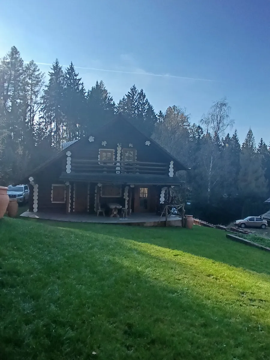 Tento luxusní dvoupodlažní dřevěný srub kombinuje rustikální kouzlo s moderním komfortem. Viditelné dřevěné trámy a sloupy dodávají interiéru jedinečný estetický vzhled a zajišťují vysokou kvalitu celé stavby. Ložnice s balkony v 1.P. poskytují nádherný výhled na okolní přírodu a zajišťují dostatek přirozeného světla a klidu. V obývacím pokoji se nachází stylový krb, který vytápí i celý dům a dodává prostoru útulnost a teplo, ideální pro zimní večery strávené v kruhu rodiny.
