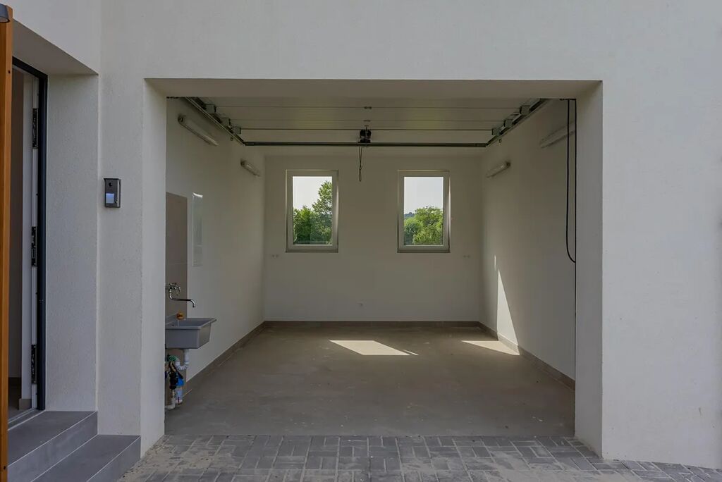Garáž s elektrickým připojením, přístupem vody a parkovací stání vedle domu.