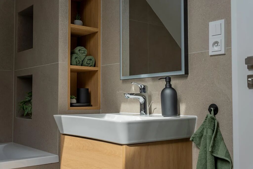 Koupelny vybavené kvalitními standardy značek Hansgrohe, Ideal Standard a Geberit.