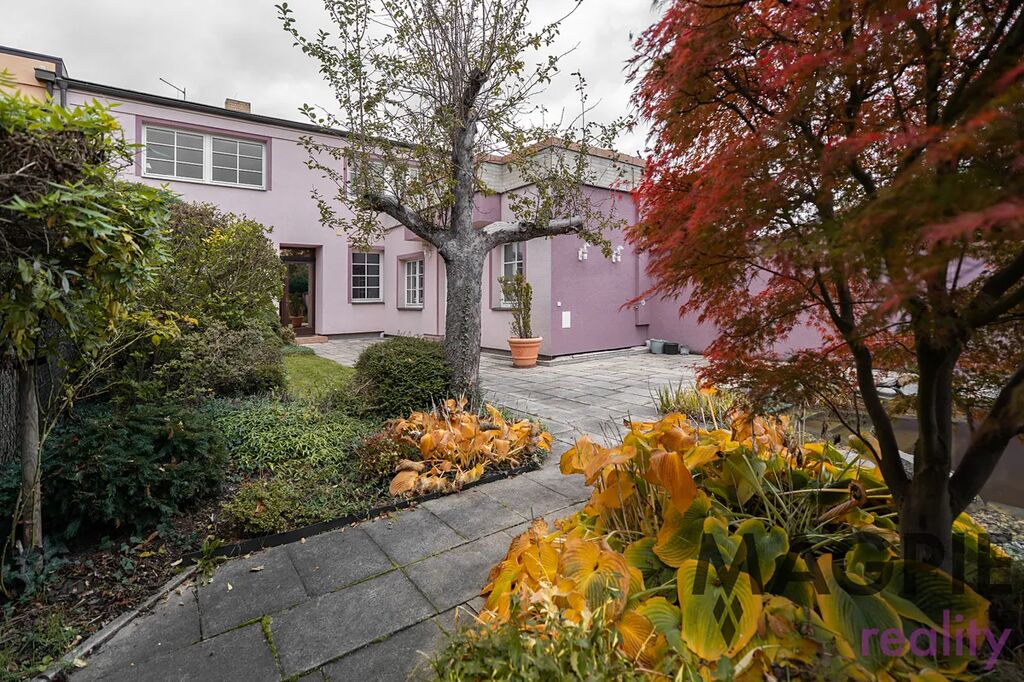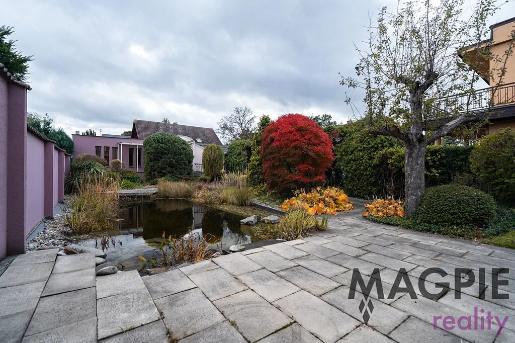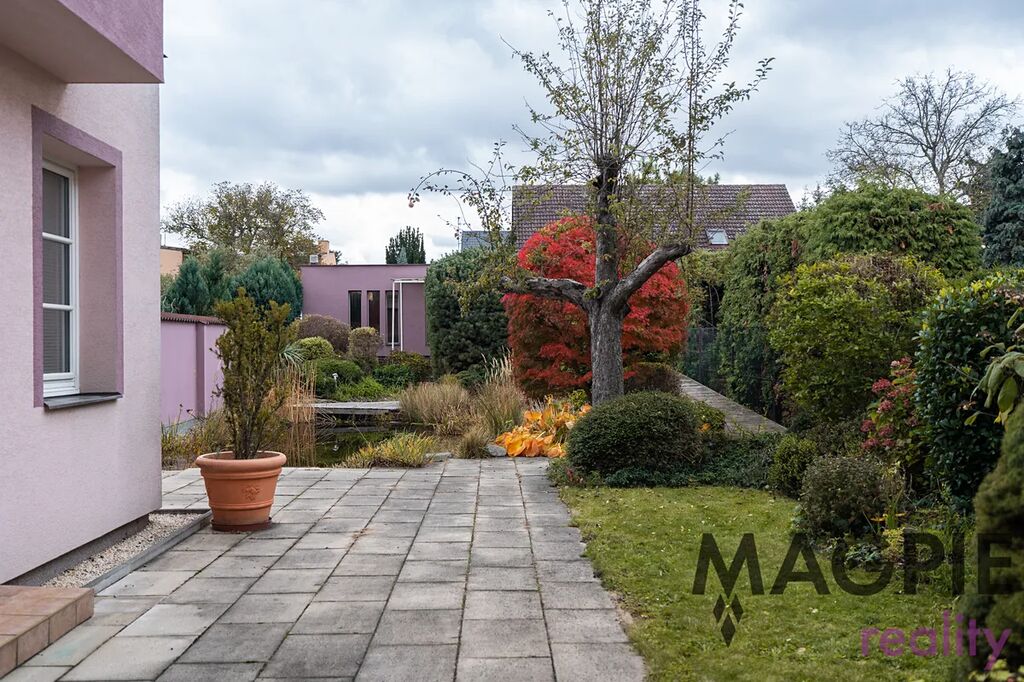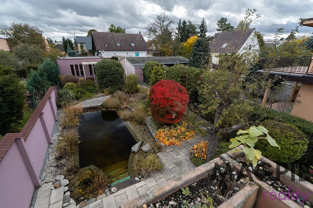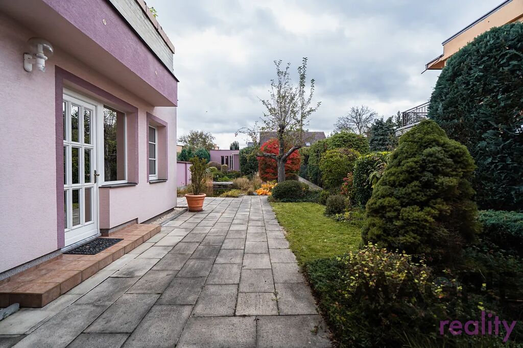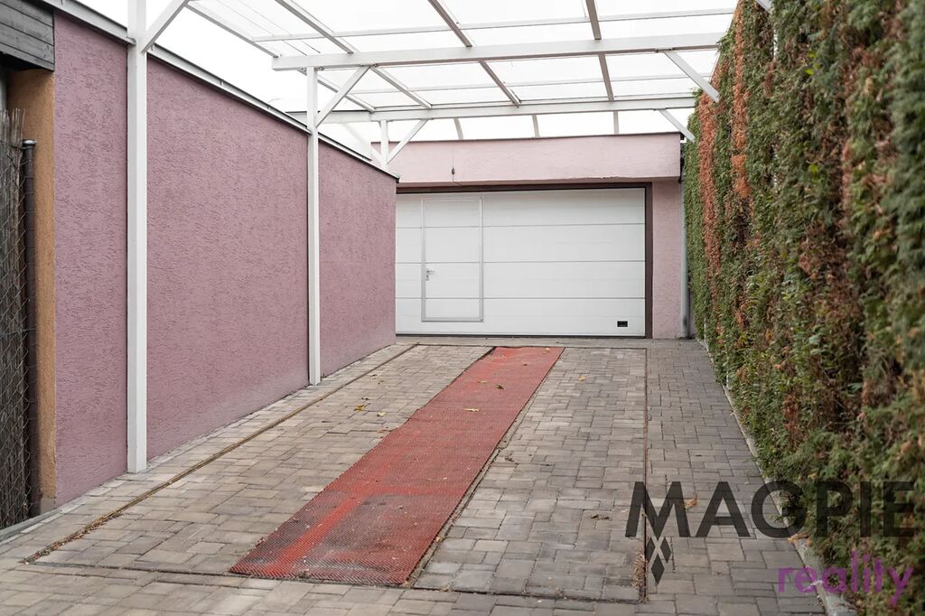 K domu patří udržovaná zahrada s biotopem o rozloze 290 m² a menší předzahrádka. Významným benefitem je mimořádné parkovací zázemí – dvoupodlažní garáž o rozloze 87 m², která díky hydraulické rampě umožňuje parkování čtyř vozů přímo v garáži. Další zastřešené stání a možnost parkování vozu na pozemku zajišťují celkovou kapacitu až pěti automobilů.