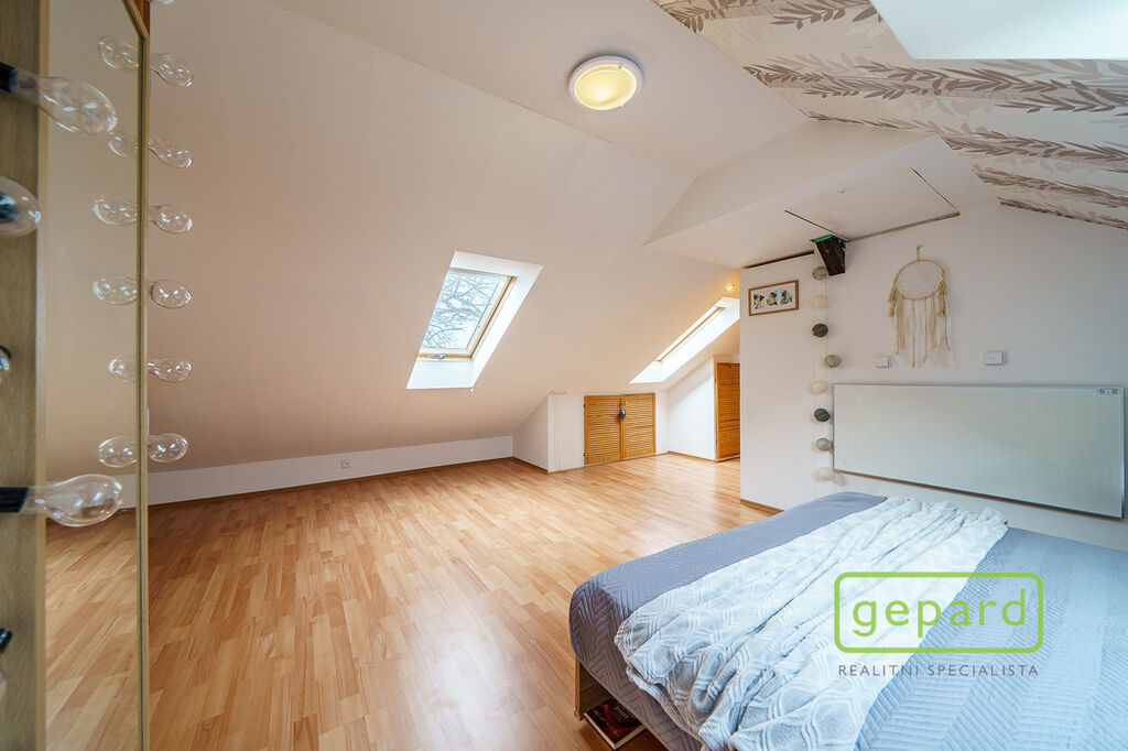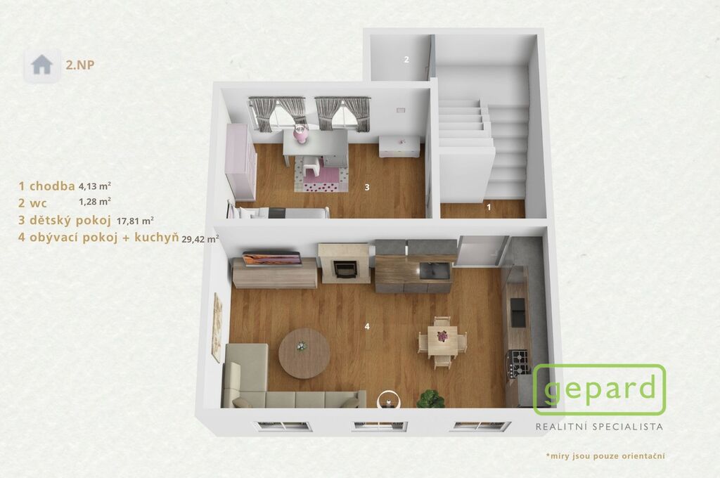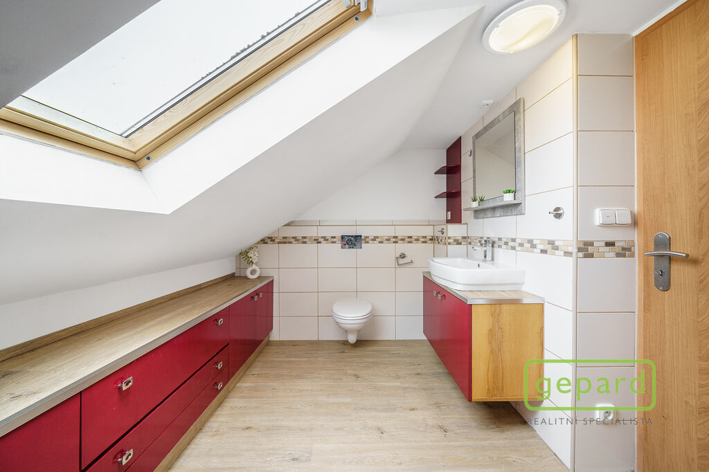 V prvním a druhém patře je světlý byt 3+kk, který už prošel rekonstrukcí a je připraven k nastěhování. Výměra 1. patra, kde je obývací pokoj s kuchyňským koutem a pokoj, je 52 m². Výměra podkroví, kde najdete další pokoj a koupelnu, je 34 m². Každý kout tohoto domu dýchá pohodou.