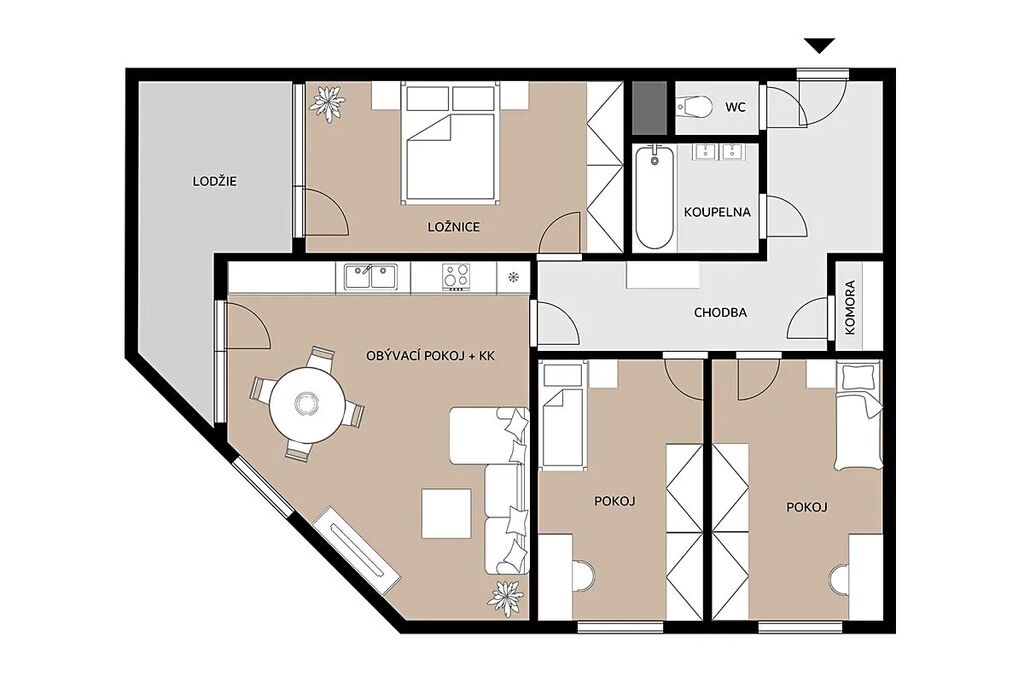 Obývací pokoj je rozvržen tak, abyste mohli z pohovky pohodlně sledovat TV i dění u jídelního stolu. Vstup do lodžie je možný z obývacího pokoje i z ložnice, dále jsou zde dva prostorné krásné pokoje, široká předsíň a chodba, z které je vstup do komory, kde je příprava pro pračku a sušičku.